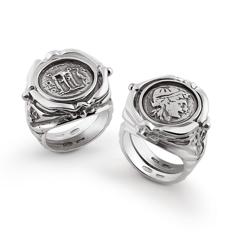 Un anello esclusivo in Argento, dalla linea accattivante e dall'estrema versatilitÓ. Una mix perfetto tra innovazione e lavorazione artigianale, con la riproduzione di una moneta girevole nella partesuperiore e un gambo dallo stile classico ed elegante.