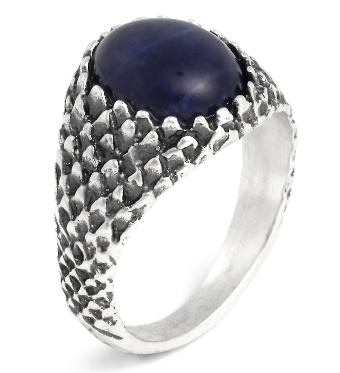 Un anello da mignolo in argento, di dimensioni ridotte, che riflette e interpreta le caratteristiche di design più distintive del brand. Esso abbina la tradizionale texture serpente ad una sodalite naturale, dal blu profondo, creando un elegante contrasto tra metallo e colore. Fatto a mano in azienda.