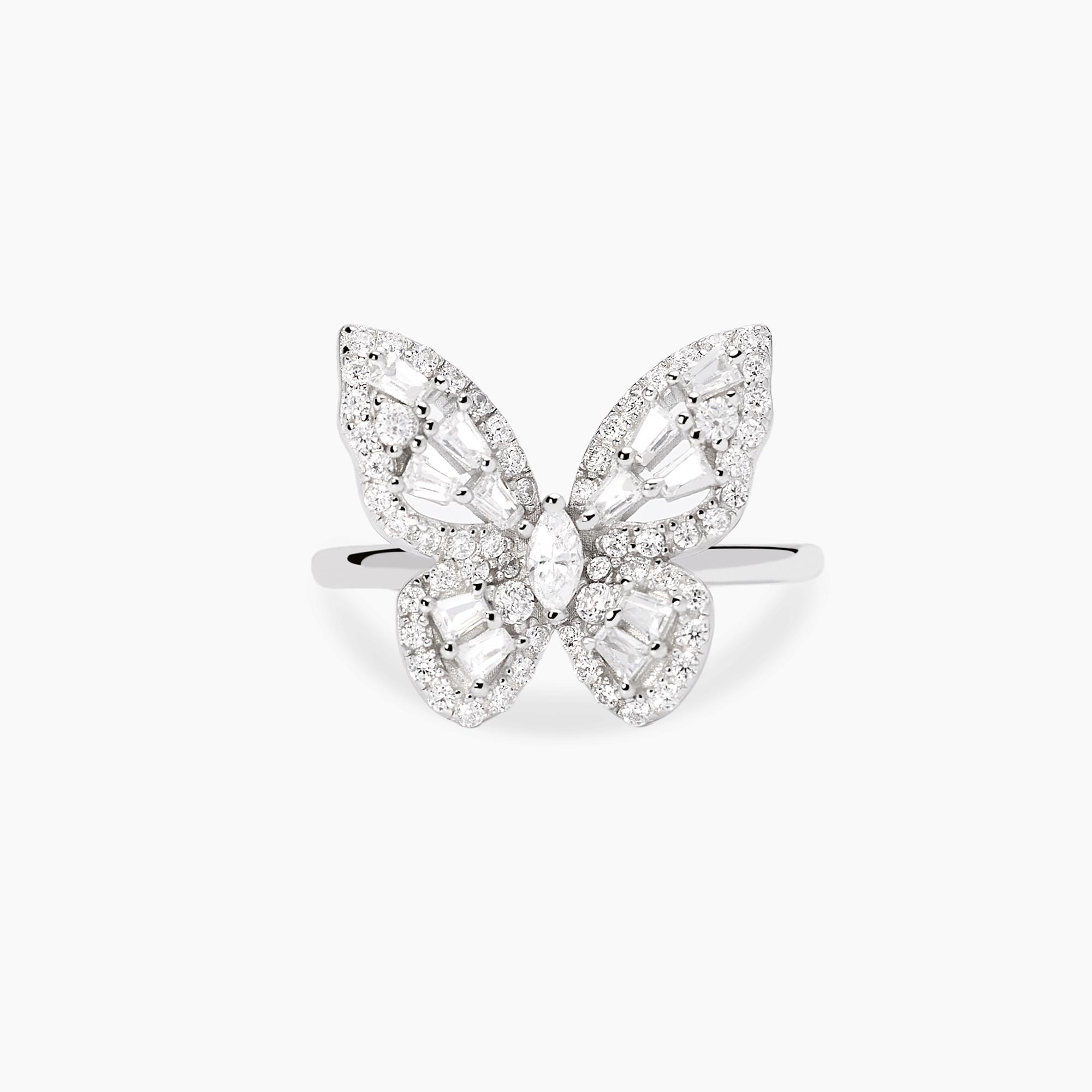 Anello regolabile in argento rodiato con farfalla in zirconi bianchi.