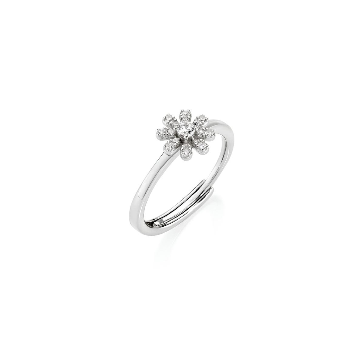 Anello regolabile in argento 925 rodiato con piccola margherita da 8 mm con zircone centrale e petali in pavé di zirconi bianchi.