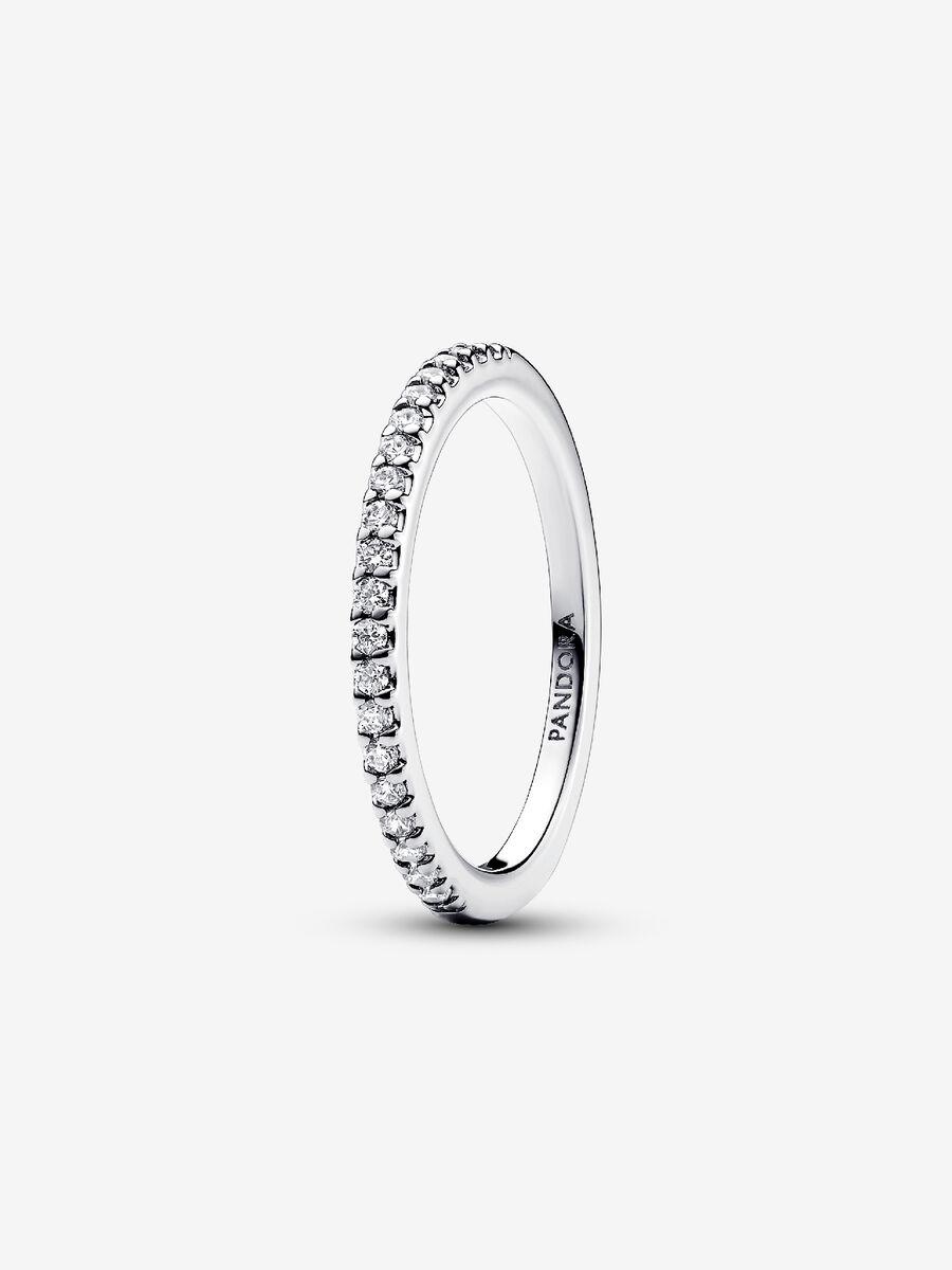 Dona al tuo look un tocco luminoso e delicato con questo Anello PavÞ Fascia Sottile. Realizzato in Argento Sterling 925, l'anello Þ decorato da una fila di pietre di zirconia cubica incolori sull'esterno della metÓ anteriore. All'interno Þ inciso l'iconico logo Pandora. Indossalo da solo o con altri gioielli decorati con pavÚ della collezione Timeless per creare un effetto luminoso.