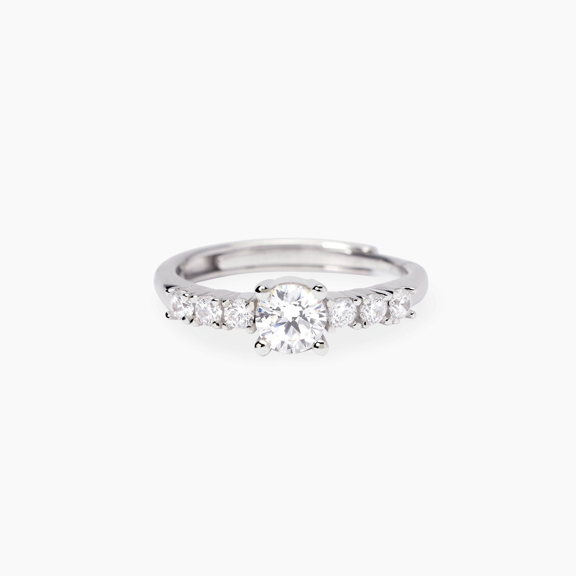 Anello regolabile in argento rodiato con zirconi bianchi.