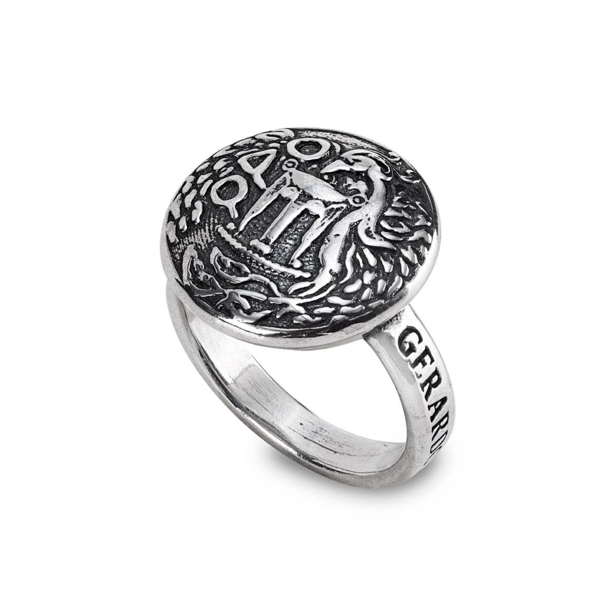 Un anello che celebra la voglia di rinascere e di condividere i bei momenti. La raffigurazione di un'araba fenice, uccello mitologico che risorge dalle proprie ceneri, si unisce al tripode, simbolo dell'antica cittÓ di Kroton. L'intensa cromia dell'argento brunito dona un allure unico e inconfondibile all'intera collezione.