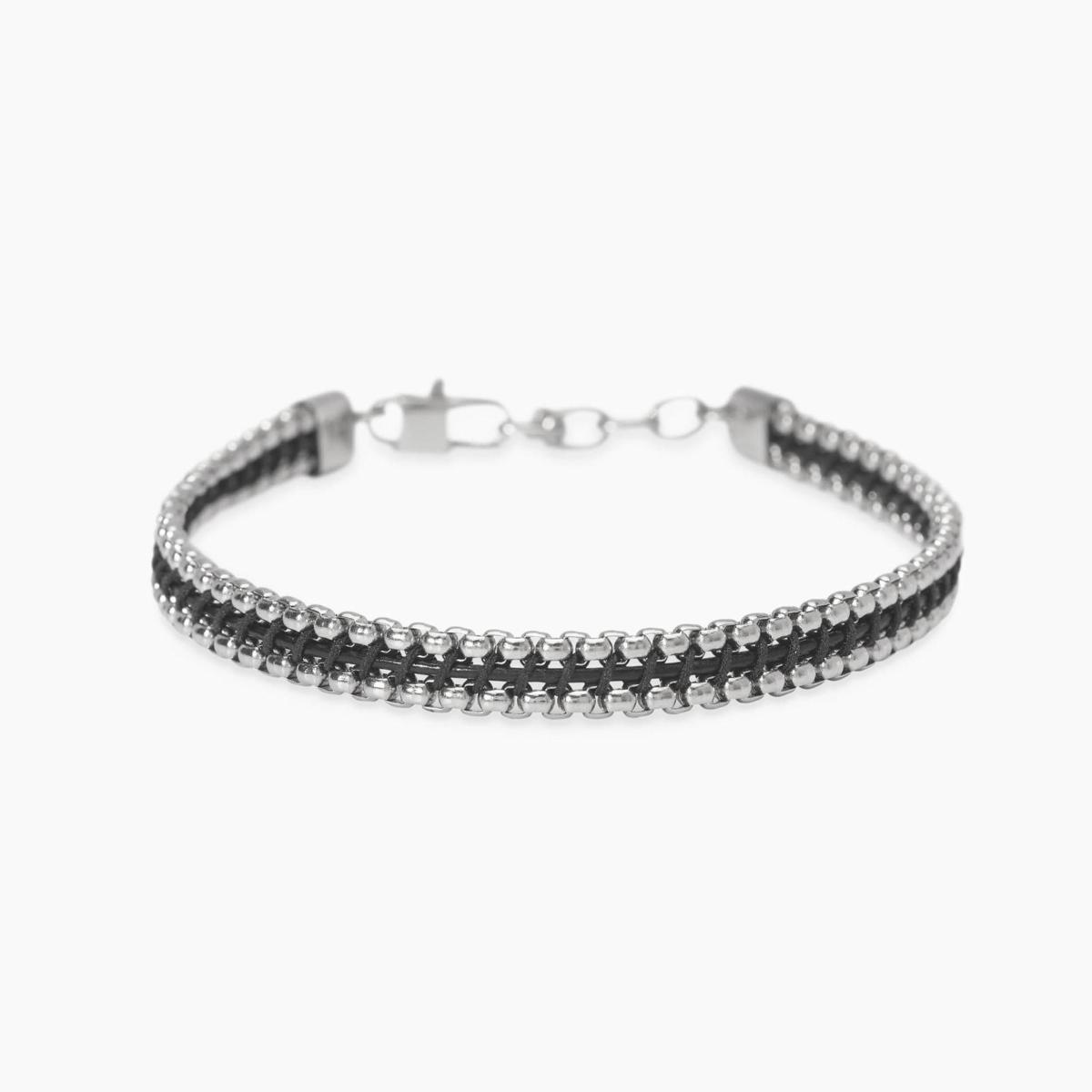 Bacciale regolabile con catene veneziane in acciaio, nylon nero e pelle interna.