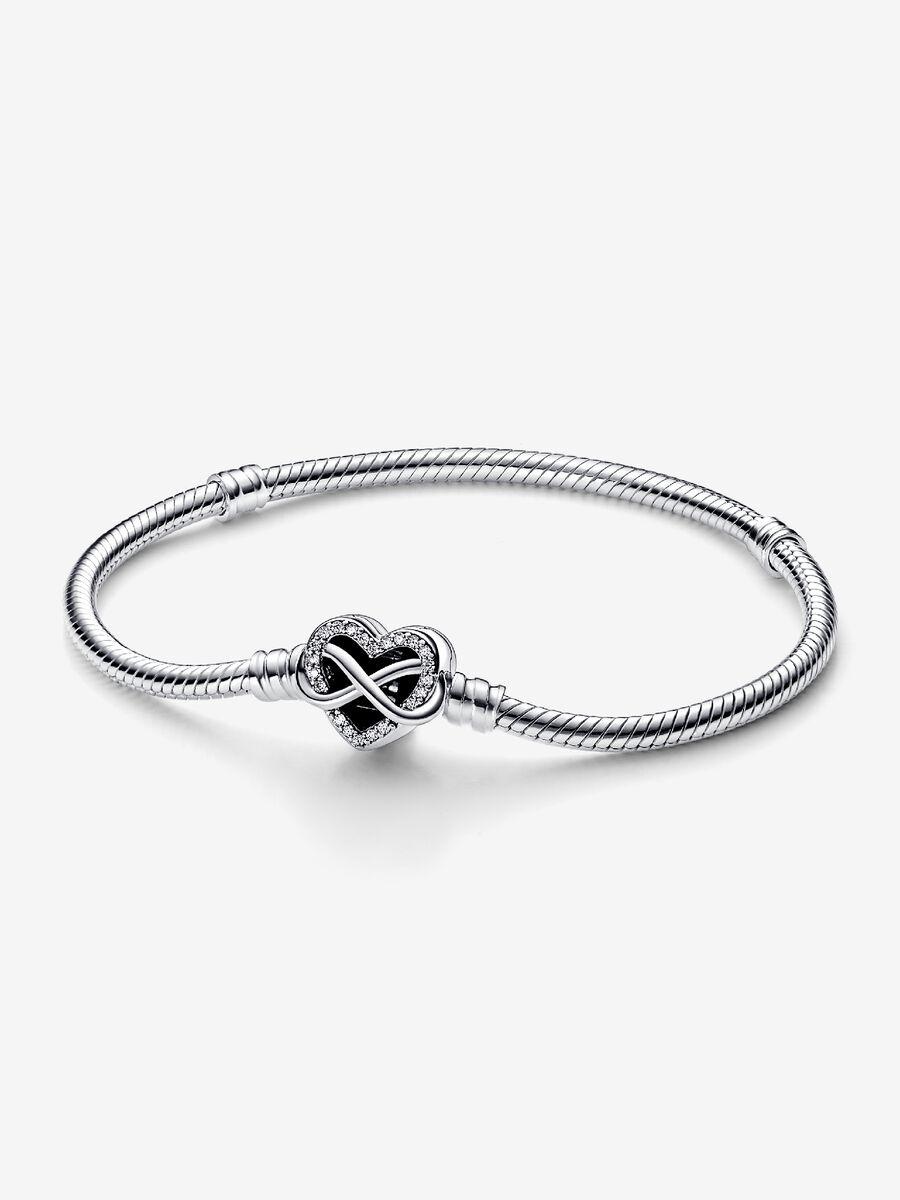 Il bracciale Pandora Moments con maglia snake e chiusura a cuore con infinito scintillante, che rappresenta l'amore eterno che unisce le famiglie, Þ un regalo ricco di significato per le persone pi¨ importanti della tua vita. La chiusura a cuore con lavorazione openwork presenta pietre scintillanti lungo il bordo e un simbolo dell'infinito asimmetrico che si avvolge intorno al cuore. Il retro della chiusura reca l'incisione "Family forever and Alwaysö (La famiglia, sempre e per sempre). Il bracciale presenta due filettature (separatori di charm sollevati) che lo suddividono in tre sezioni. Indossalo con un massimo di 16-18 dei tuoi charm o charm pendenti preferiti per rappresentare le persone che ami oppure regalalo a qualcuno vicino al tuo cuore.