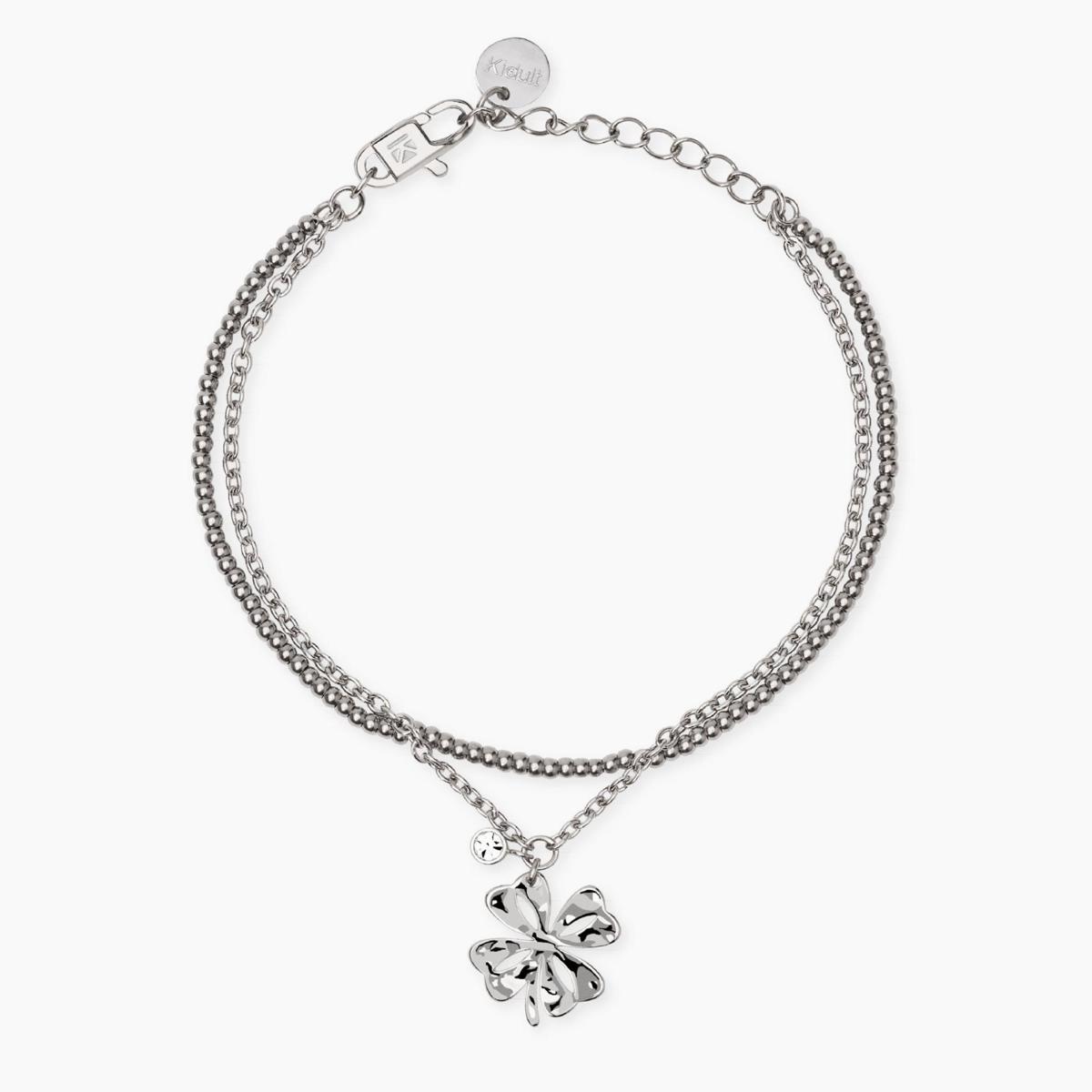 Bracciale regolabile con catena rolò in acciaio e catena in sfere con ciondolo quadrifoglio in acciaio martellato e cristallo.