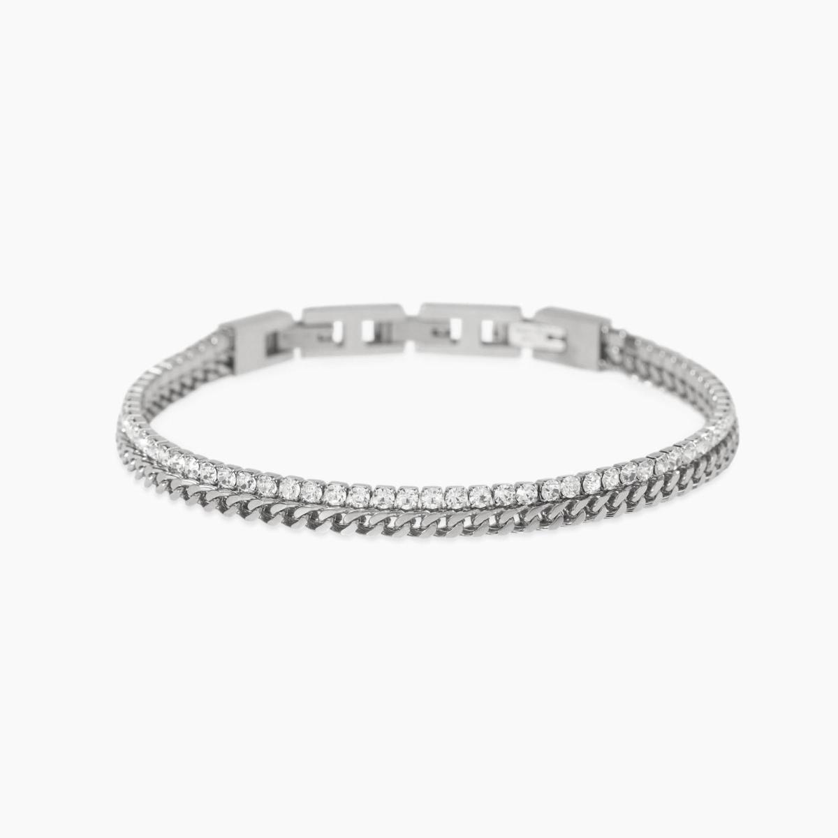 Bracciale regolabile con catena franco in acciaio e catena tennis in cristalli bianchi.