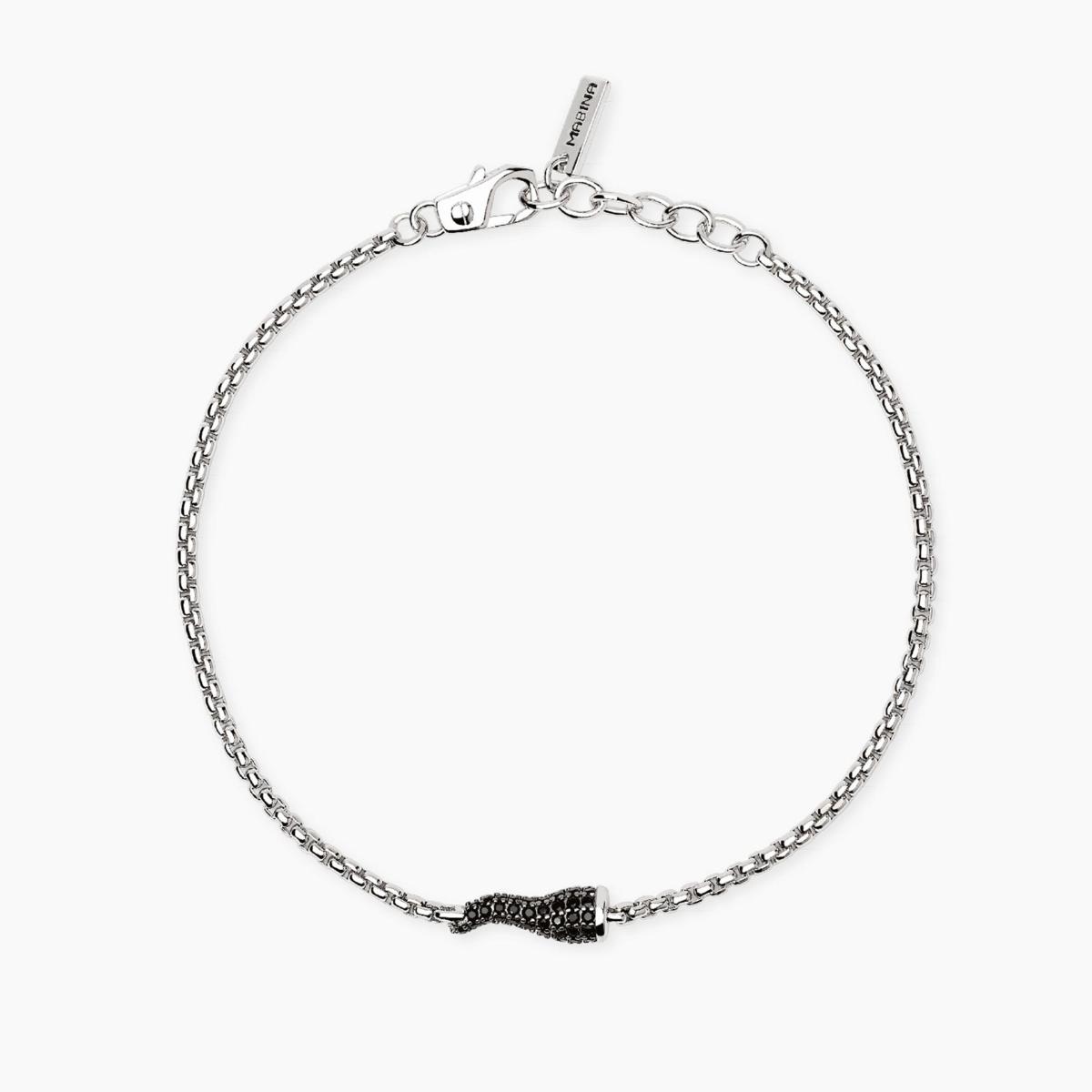 Bracciale regolabile in argento rodiato con catena veneta e cornetto centrale in zirconi neri.