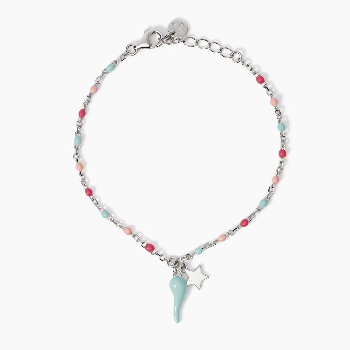 Bracciale in argento rodiato con catena forzatina, inserti smaltati multicolor e cornetto smaltato azzurro.