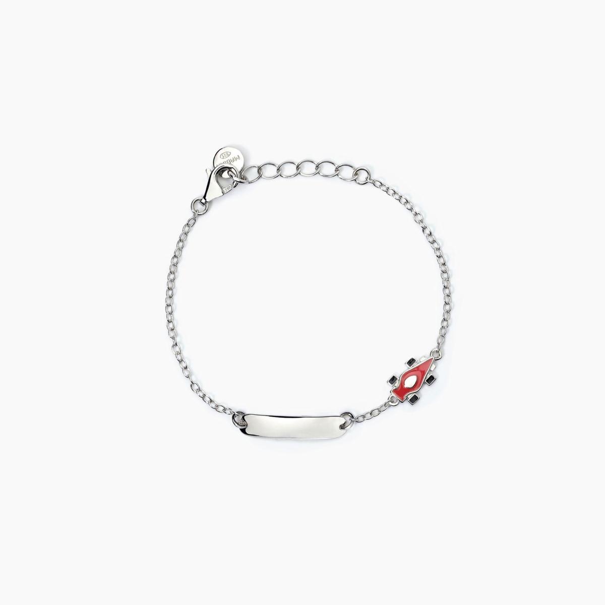Bracciale neonato regolabile in argento rodiato con catena forzatina, piastra personalizzabile e macchinina smaltata. Un gioiello adatto alle occasioni speciali grazie alla possibilità di effettuare incisioni, es. date, iniziali o nomi.