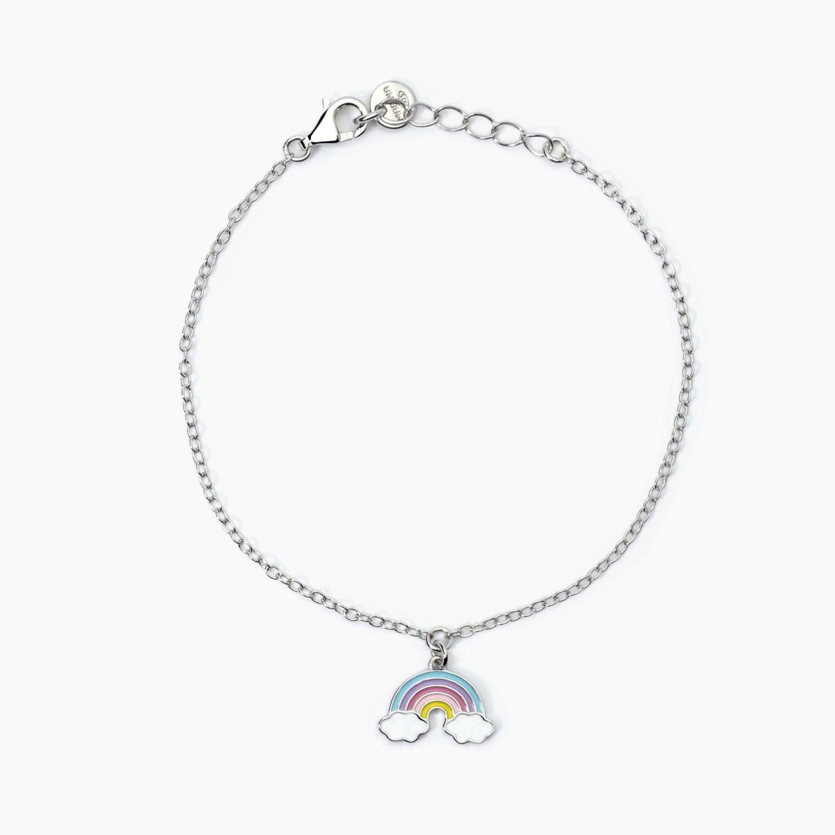 Bracciale bimba regolabile in argento rodiato con catena forzatina e ciondolo arcobaleno smaltato.