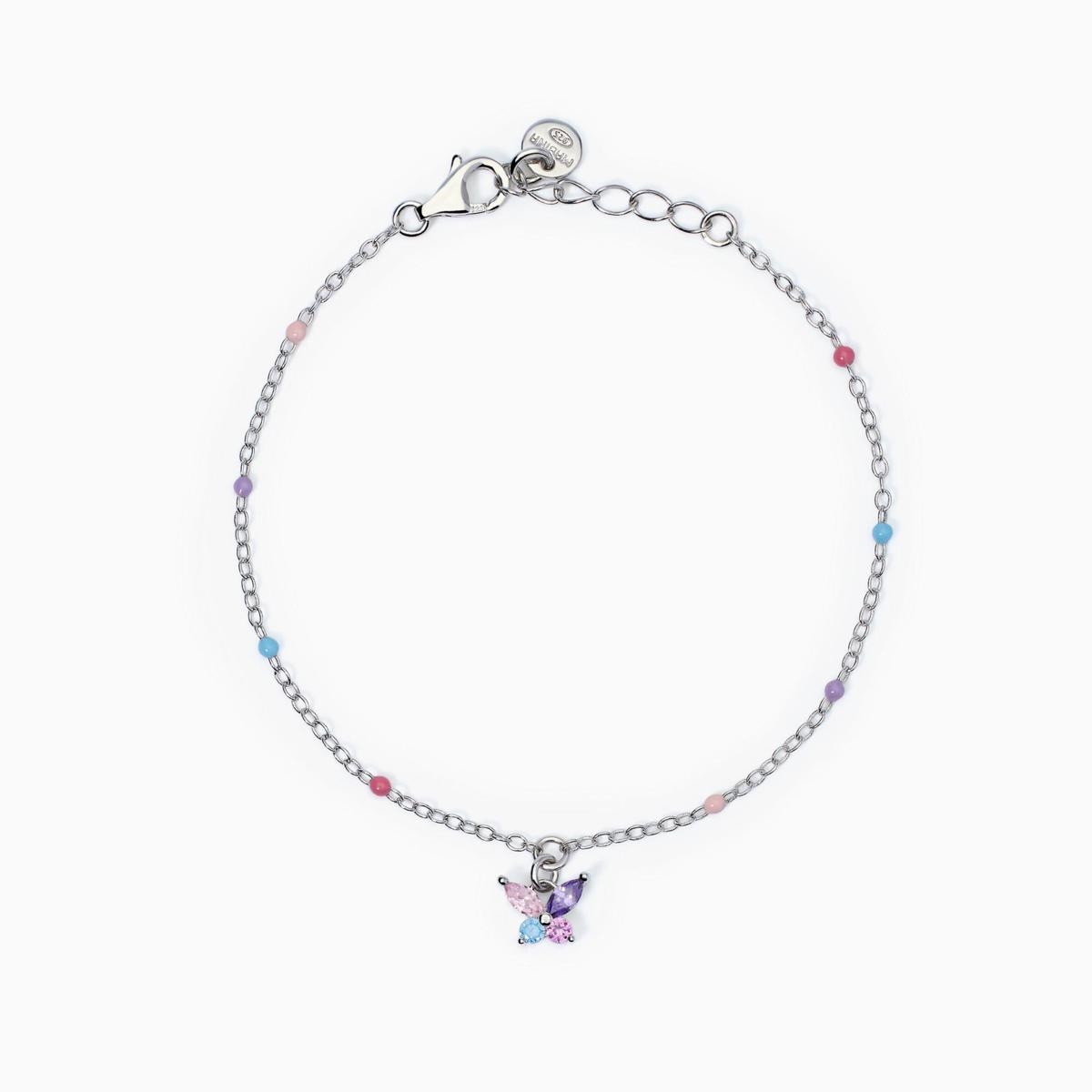 Bracciale regolabile da bambina in argento rodiato con catena forzatina, applicazioni smaltate e ciondolo a forma di farfalla in tormalina sintetica rosa e zirconi multicolor taglio a navette.