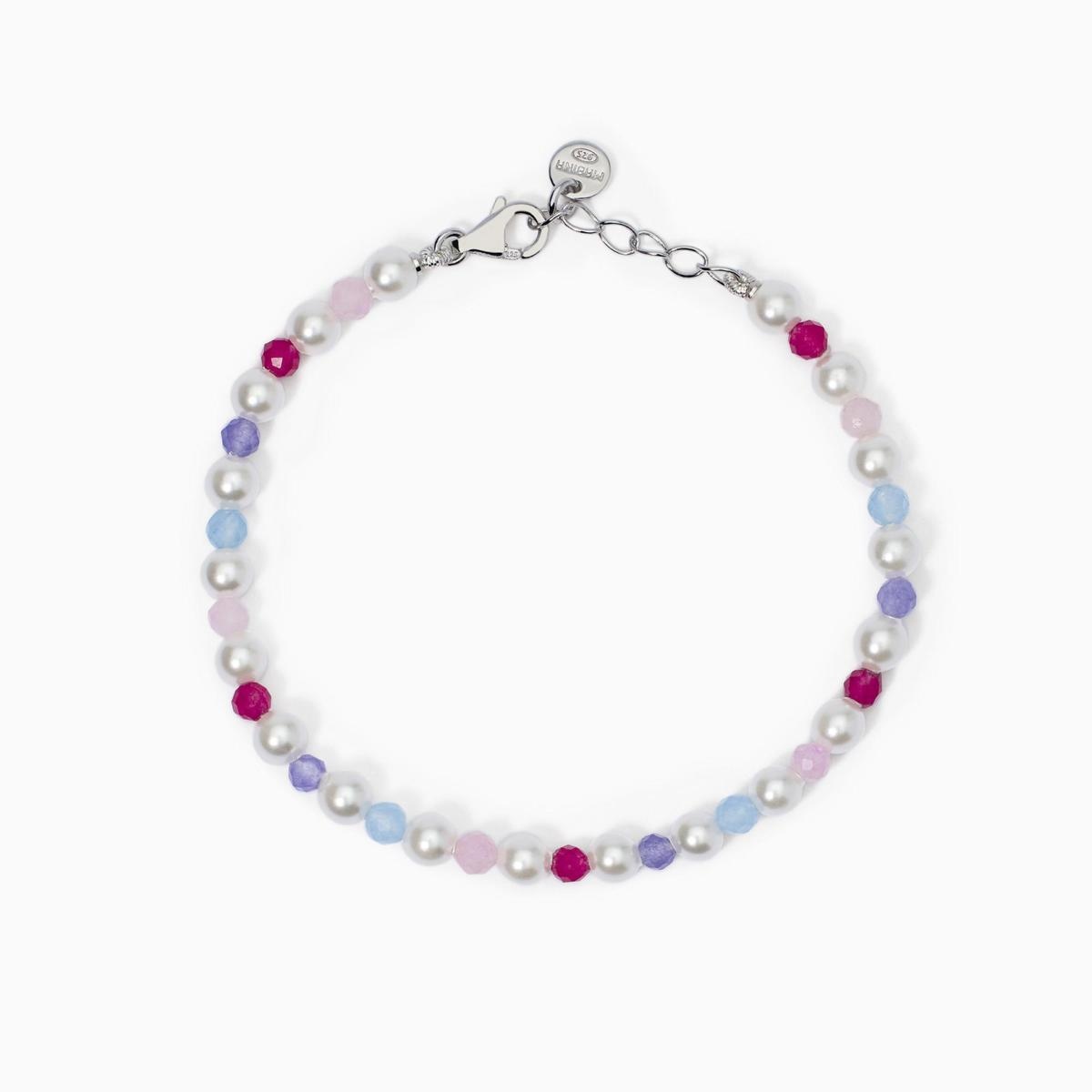 Bracciale regolabile da bambina in argento rodiato con giada faccettata multicolor e perle conchiglia.