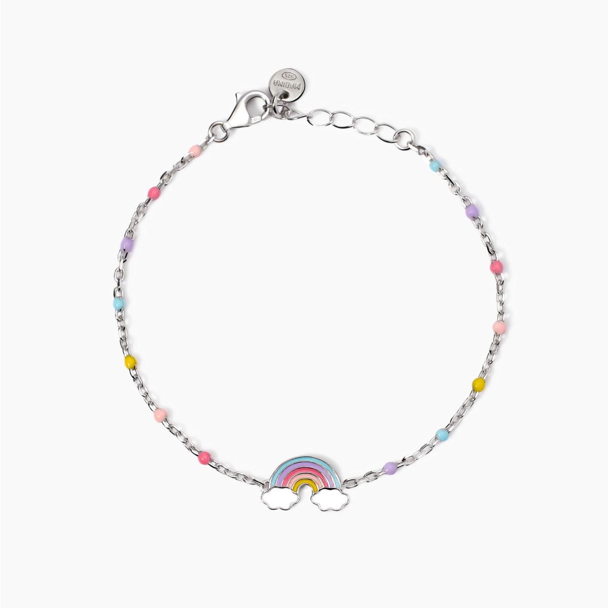 Bracciale regolabile da bambina in argento rodiato con inserti smaltati, catena forzatina ed elemento centrale smaltato a forma di arcobaleno.