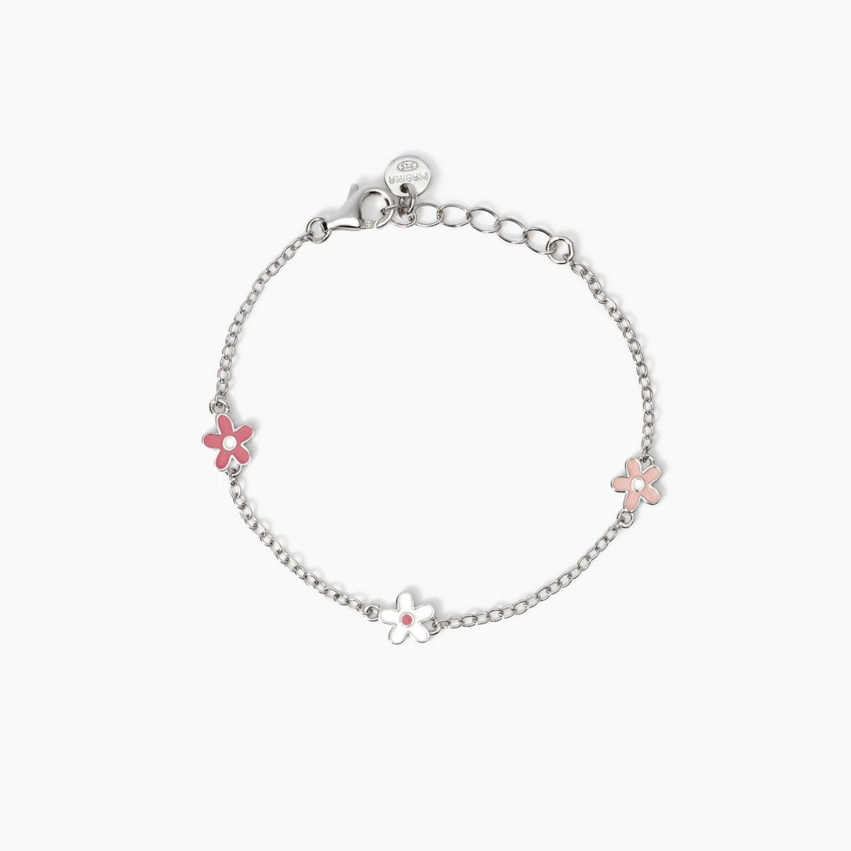 Bracciale regolabile in argento rodiato con catena rolò e fiorellini smaltati rosa e bianchi.