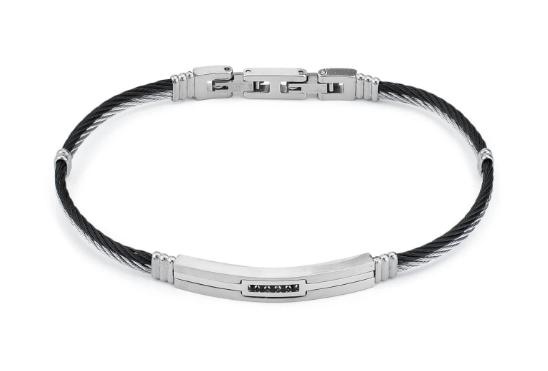 Bracciale in acciaio a cordino in acciaio e cordino nero, con centrale di pietre Cubic zirconia nera incastonate.