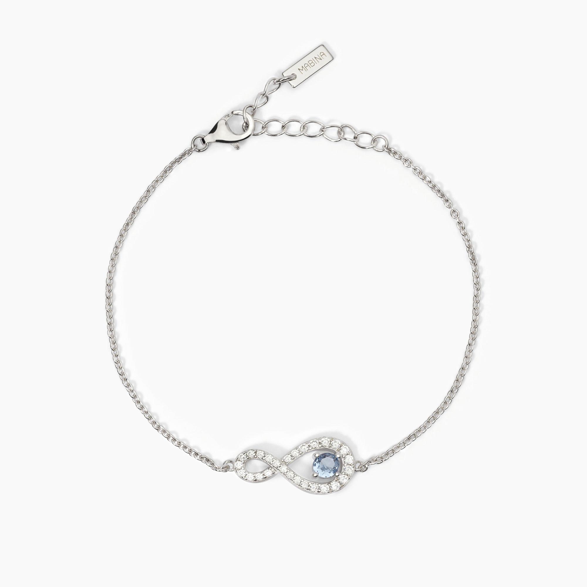 Bracciale regolabile da donna in argento rodiato con catena forzatina e elemento infinito con acquamarina sintetica e zirconi bianchi.