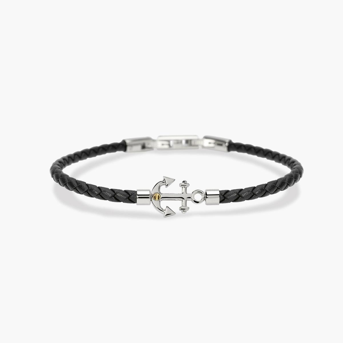 Bracciale in acciaio e lab leather nera intrecciata con ancora centrale. • Larghezza braciale: 3,5 mm • Dimensione ancora: 15,1x11,3 mm • Diametro viti: 2 mm • Misura regolabile, lunghezza da 19 a 21 cm • Materiale: Acciaio 316L, Lab-leather, PVD giallo