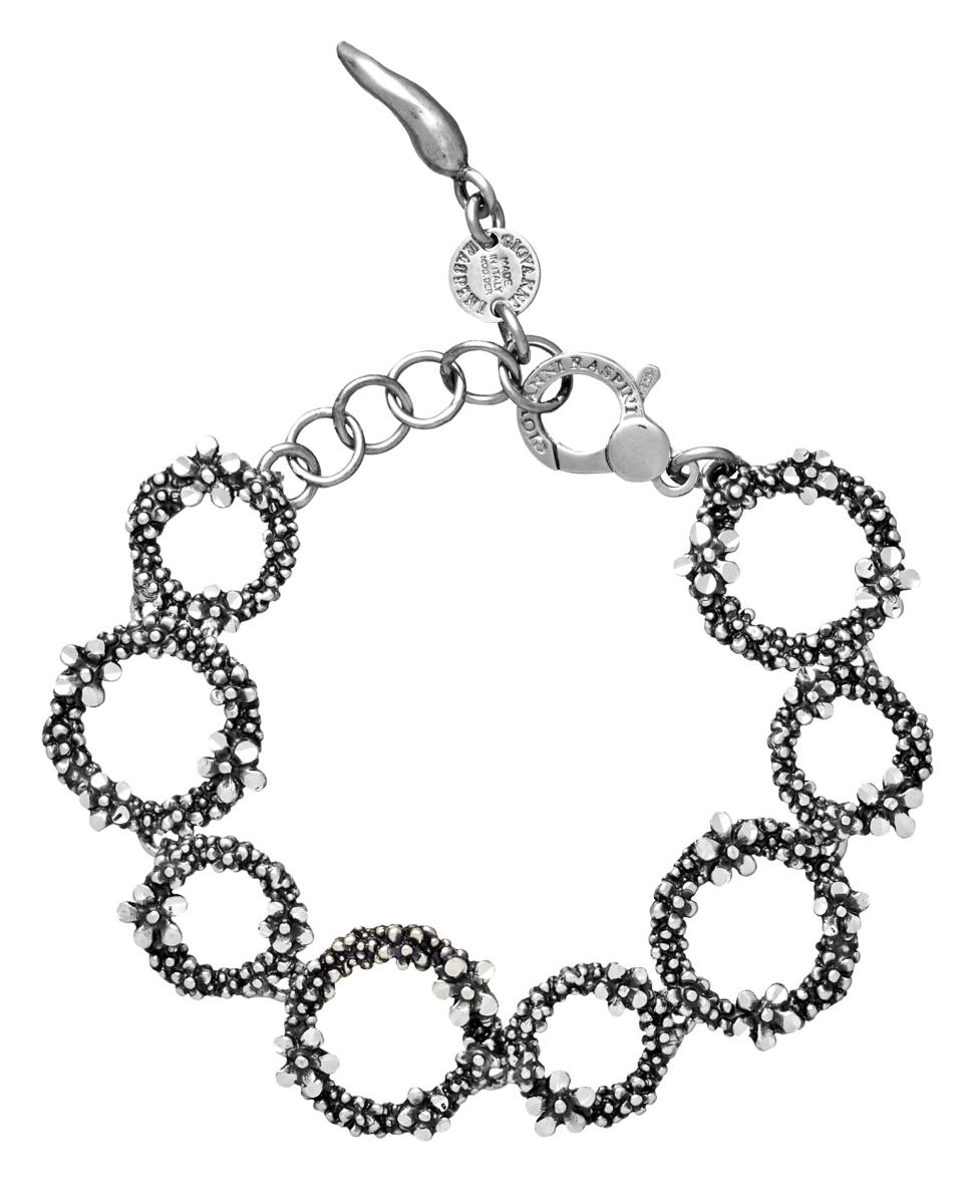Eleganza leggera da indossare al polso. La lavorazione artigianale della fusione a cera persa su argento brunito, è abbinata in questo bracciale all'effetto della diamantatura, che conferisce ai minuscoli e graziosi petali un effetto scintillante.