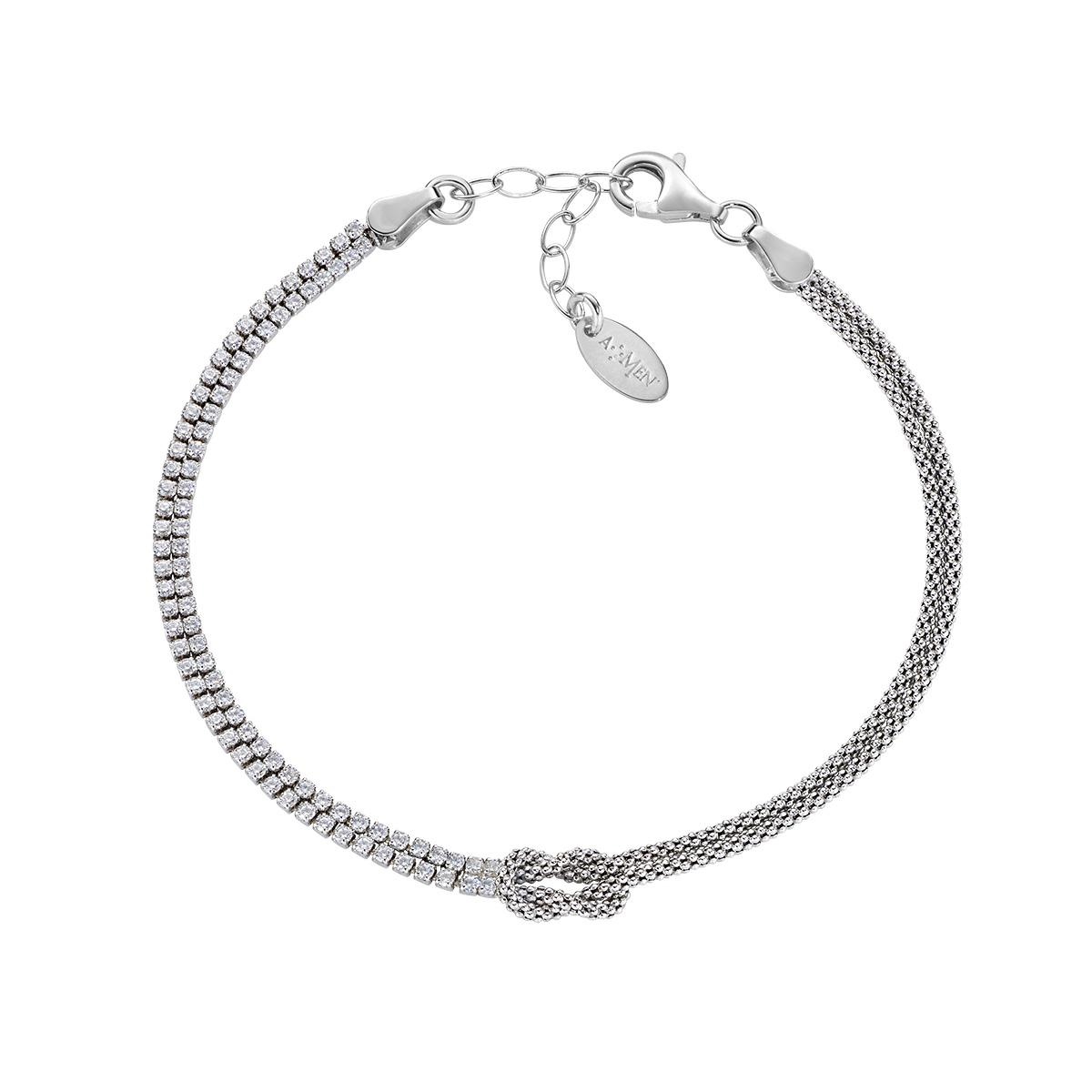 Bracciale in argento 925 rodiato con due catene unite a formare un nodo centrale. Una delle catene è un tennis con scintillanti zirconi bianchi. Il Bracciale Nodo d'Amore è il simbolo tangibile di ogni legame indissolubile. Celebra l'intreccio unico con la tua persona del cuore e raccontalo scegliendo il colore che più lo rappresenta!