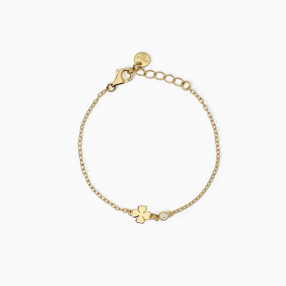 Bracciale regolabile da bambini in argento placcato oro 18K con catena forzatina, quadrifoglio e zircone.
