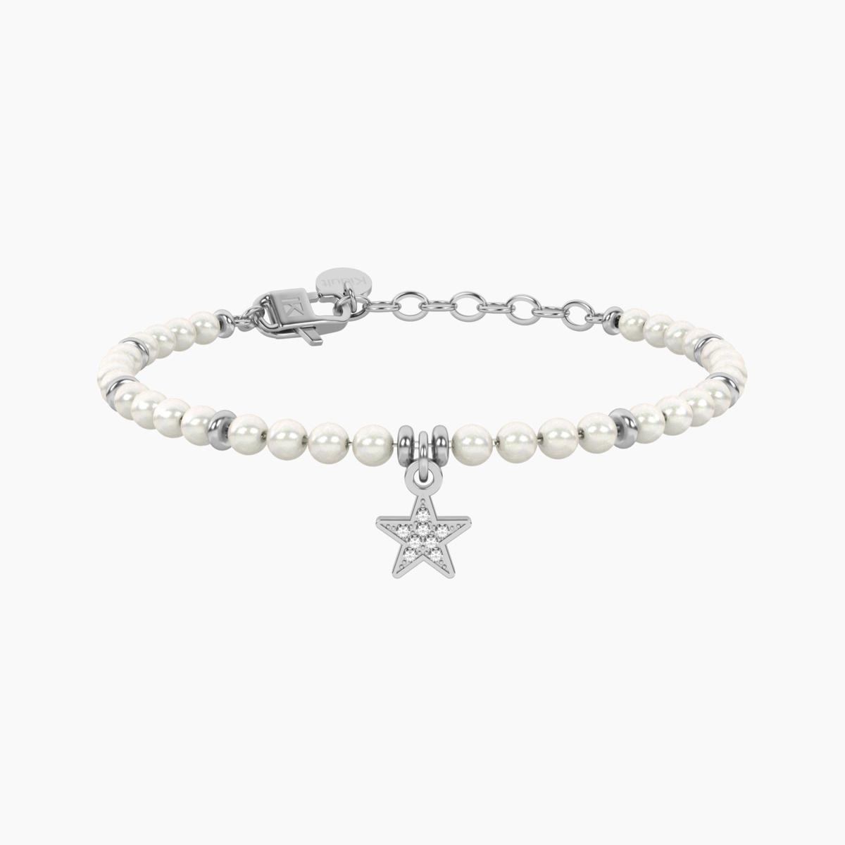 Bracciale da donna regolabile in acciaio con perle conchiglia e ciondolo a forma di stella con cristalli.