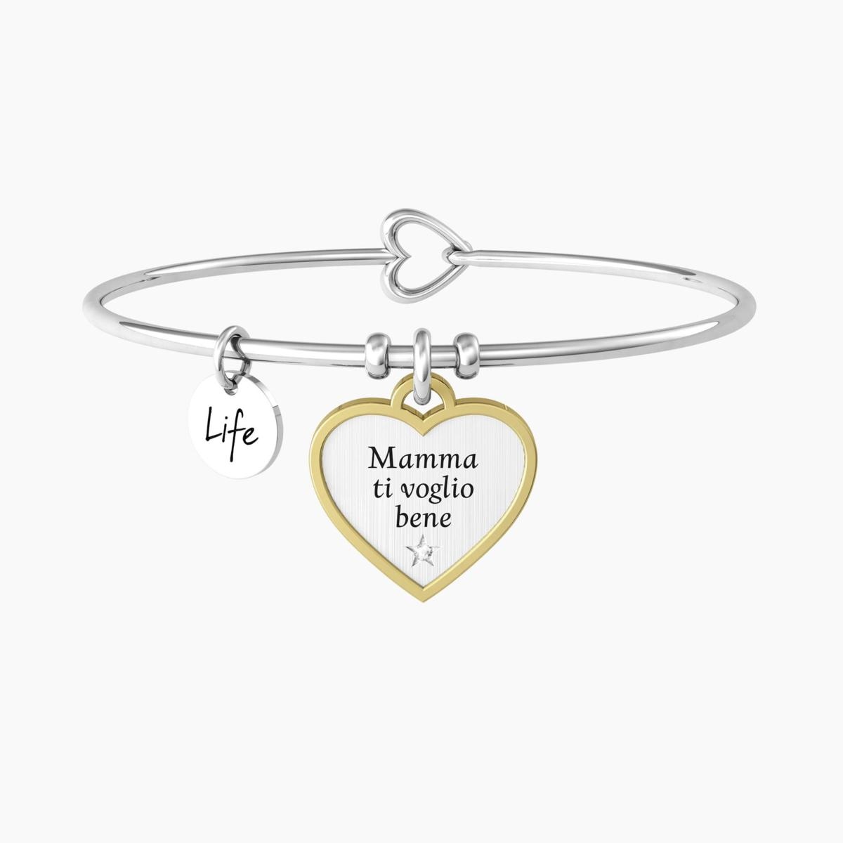 Bangle in acciaio con ciondolo a forma di cuore satinato con bordo dorato lucido, cristallo bianco e frase "Mamma ti voglio bene per ogni cosa speciale che hai fatto per me".