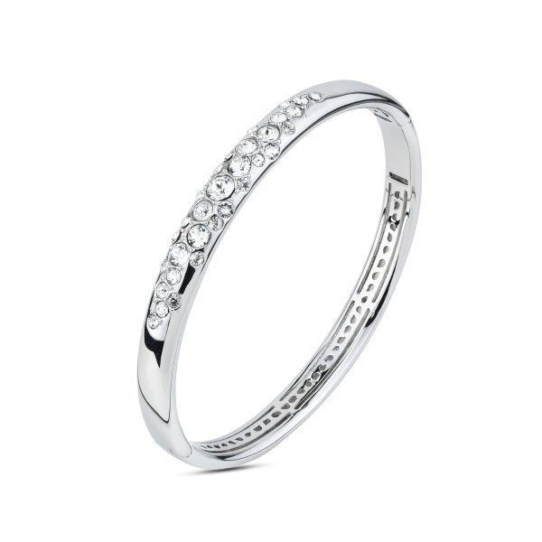 Bracciale rigido rodiato con decoro centrale di cristalli crystal. Produzione: realizzato in Italia Misure: diametro cm 5,8; spessore centrale cm 1 Chiusura: a scatto Garanzia: 2 anni