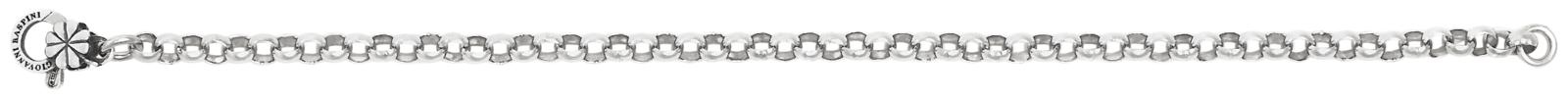 Questo bracciale base in argento, realizzato artigianalmente con una fine catena rol?, Þ il punto di partenza ideale per creare un pezzo unico con i tuoi charms preferiti. La chiusura Þ impreziosita da un delicato decoro a forma di Quadrifoglio, fuso a cera persa. Realizzato a mano in azienda.