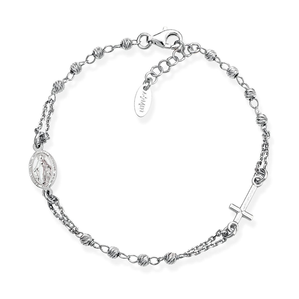 Bracciale rosario in argento 925 rodiato con grani diamantati da 3 mm, croce e medaglietta rappresentante la Madonna Miracolosa. Il bracciale ha lunghezza regolabile da 18 a 20 cm con chiusura a moschettone e catenina di allungo.
