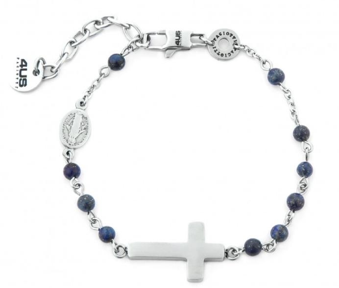 Braccialetto rosario realizzato in acciaio anallergico con finitura rodiata e mini sfere in lapis blu.