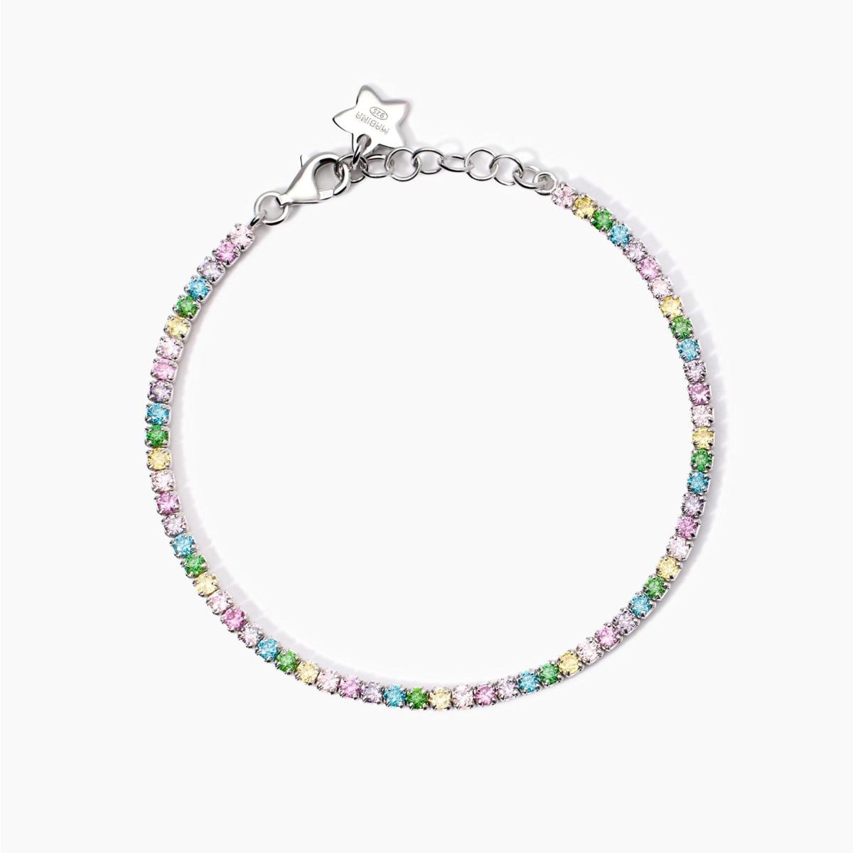 Bracciale tennis da bambina in argento rodiato con corindone rosa sintetico e zirconi multicolor. • Diametro zirconi: 2 mm • Misura regolabile, lunghezza da 14,5 a 16,5 cm • Chiusura con moschettone • Materiale: Argento 925, Zirconi, Corindone sintetico