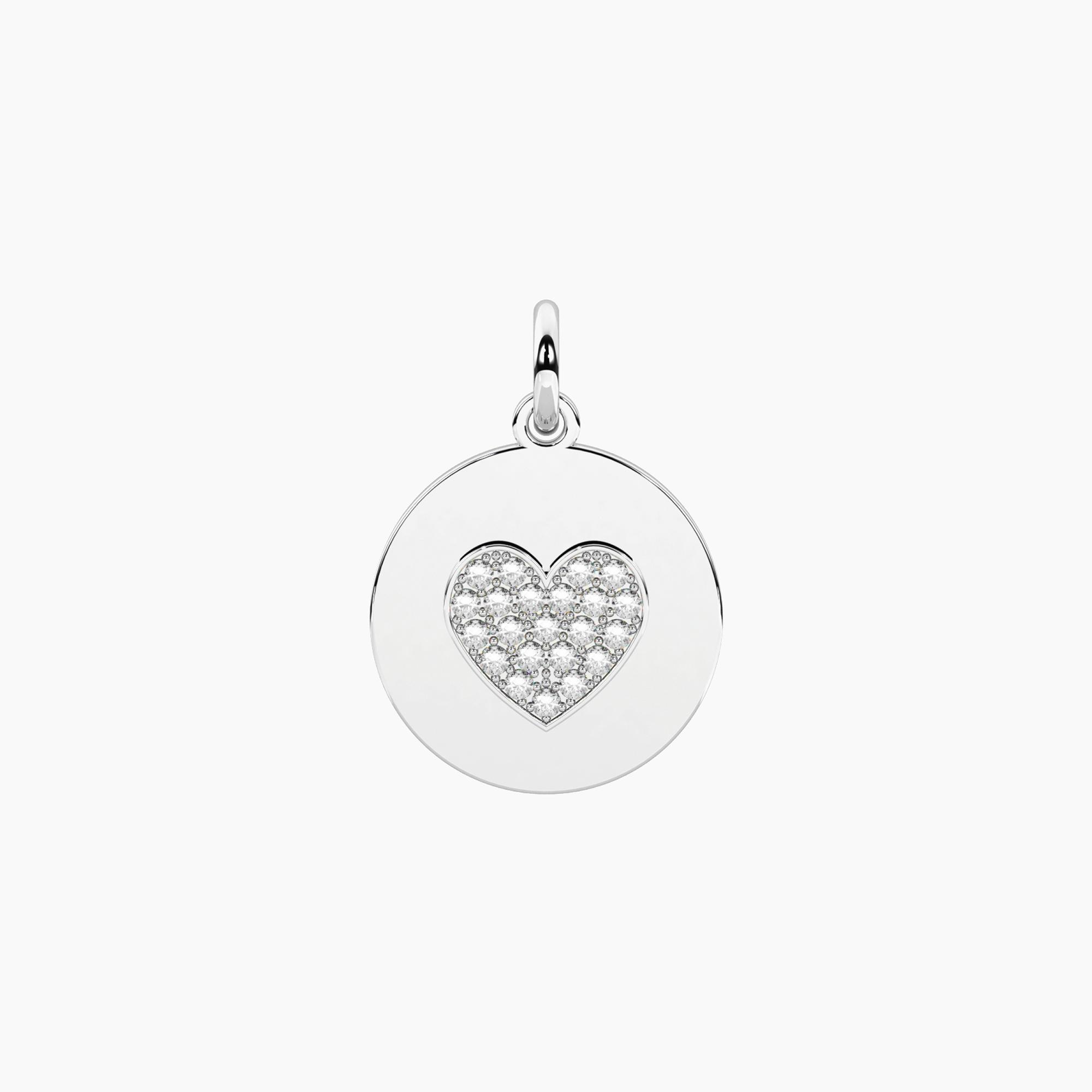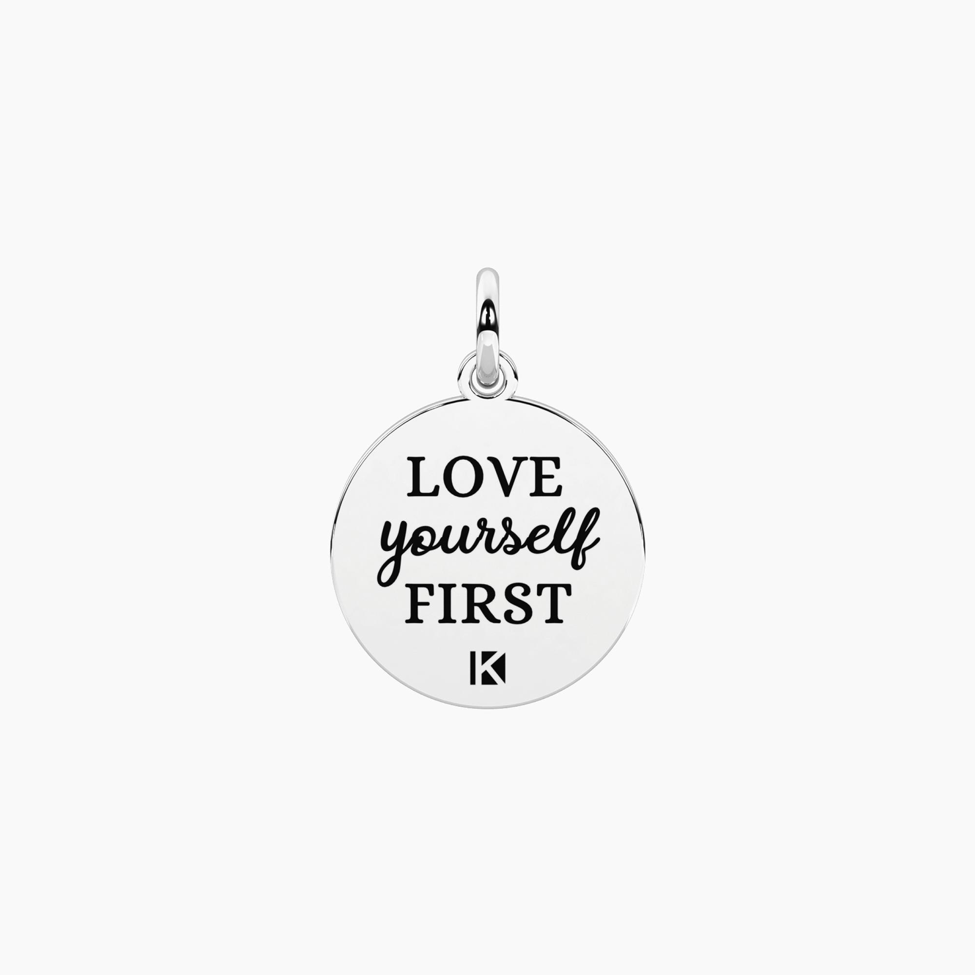 Ciondolo tondo in acciaio con elemento a forma di cuore con cristalli bianchi e scritta "Love yourself first".