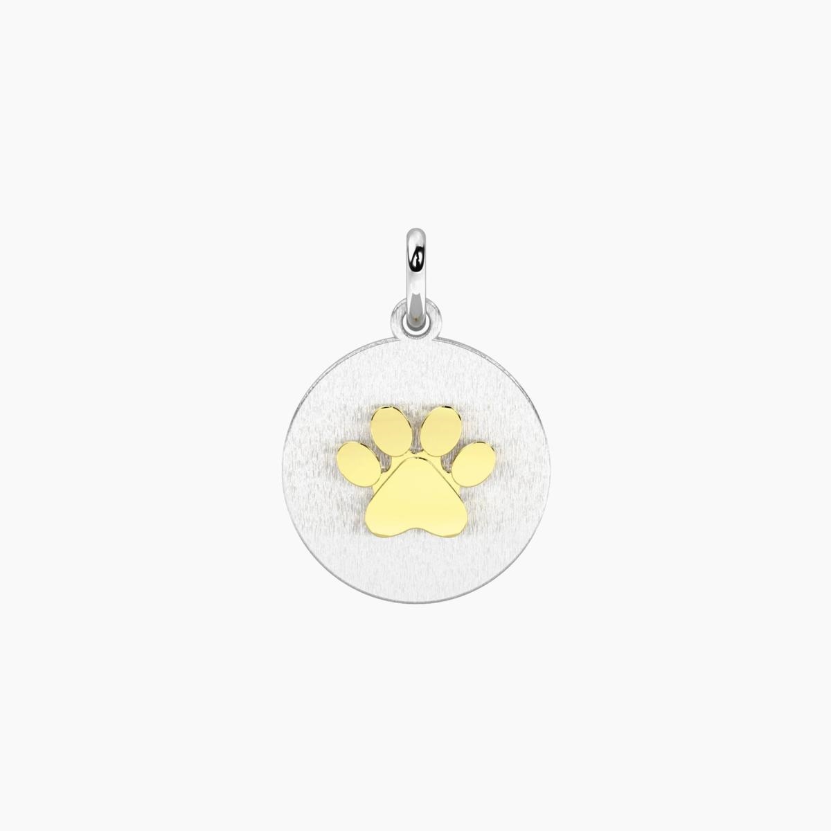 Ciondolo tondo in acciaio satinato con elemento a forma di zampa in PVD giallo lucido e cristallo bianco.