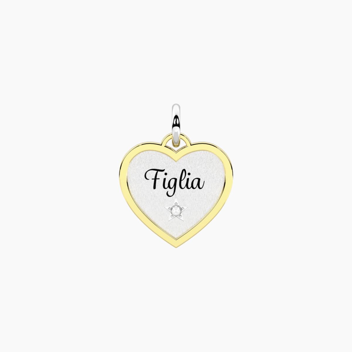 Ciondolo a forma di cuore in acciaio satinato con PVD giallo lucido, cristallo bianco e scritta "Figlia". Retro ideale per incisione.