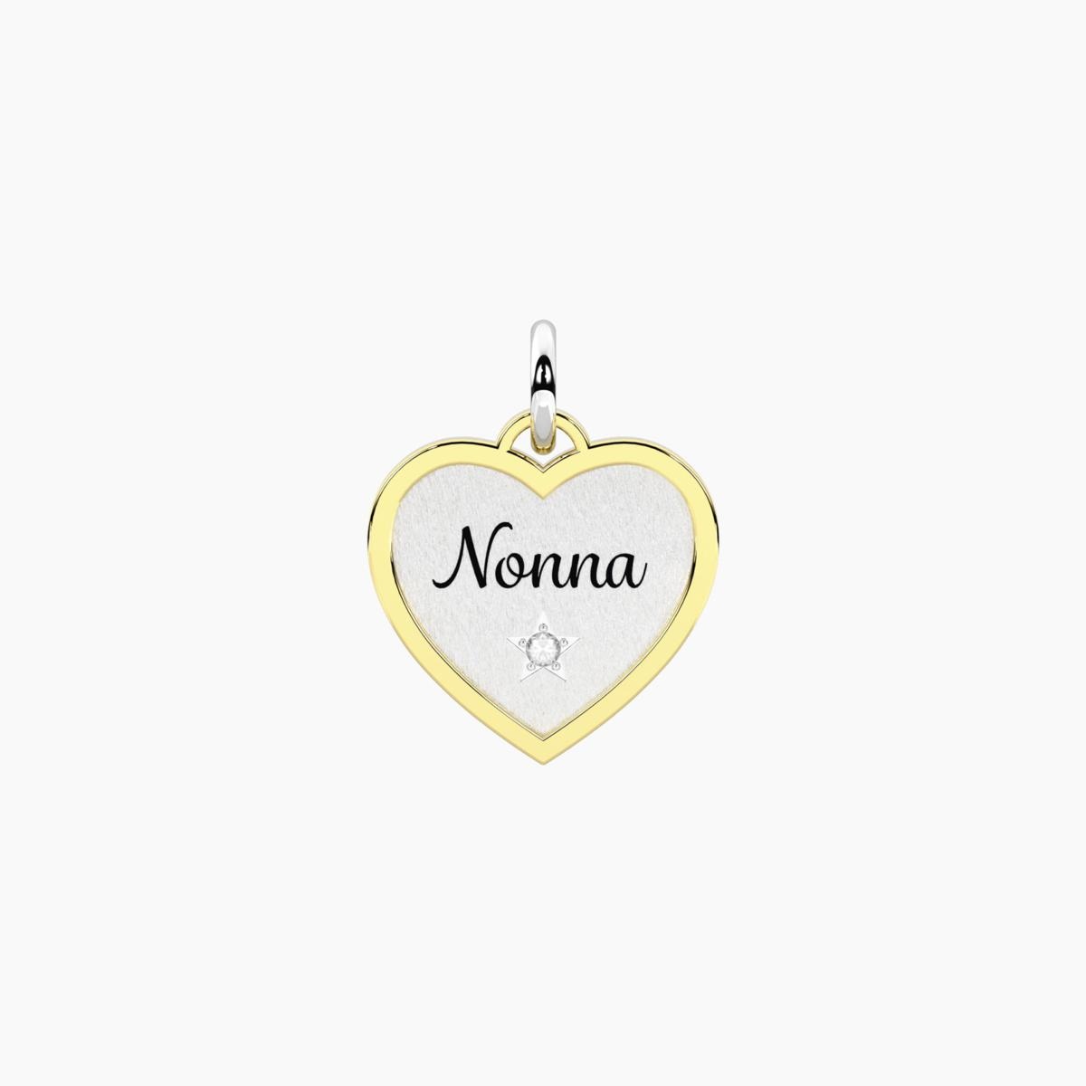 Ciondolo a forma di cuore in acciaio satinato con PVD giallo lucido, cristallo bianco, retro incidibile e scritta "Nonna".