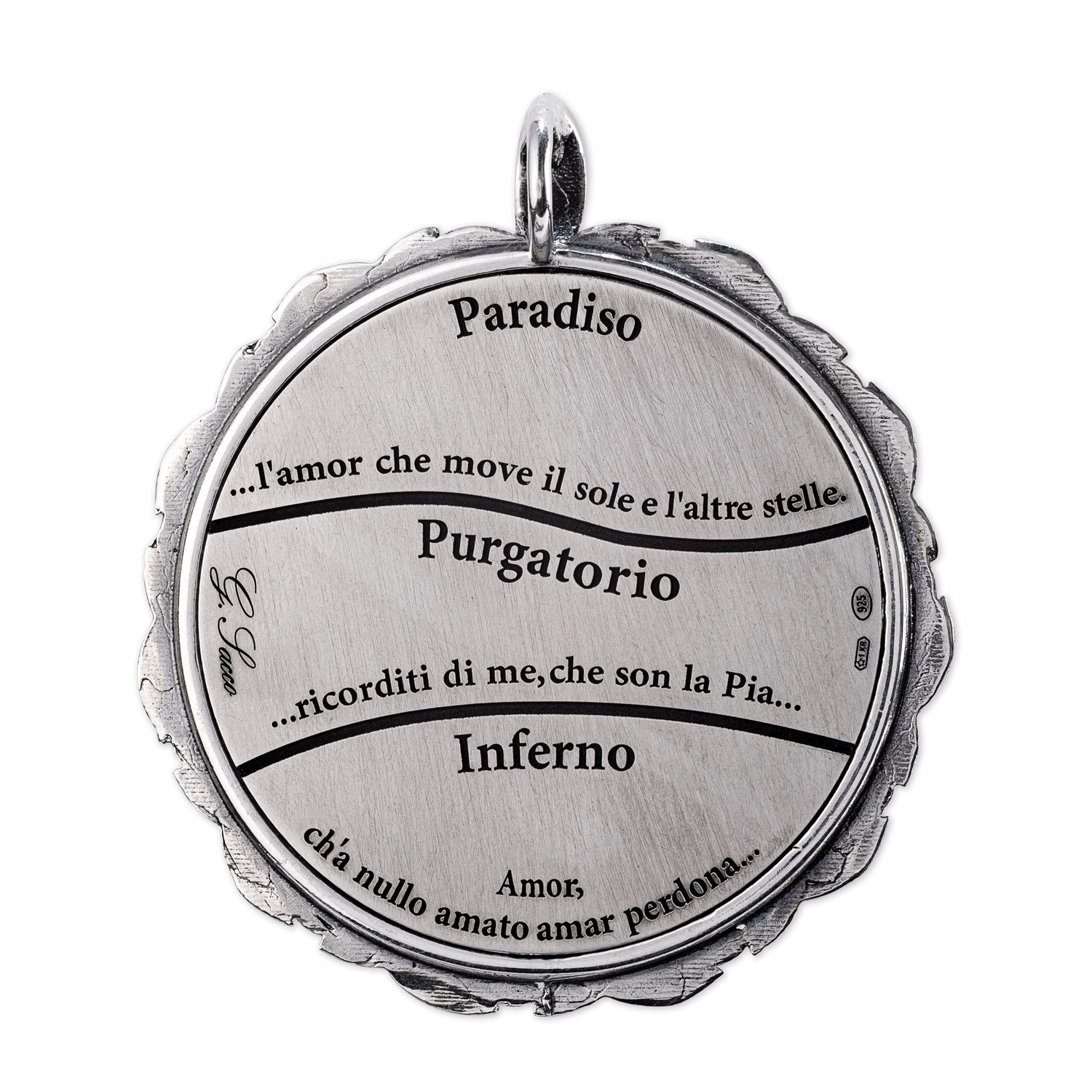 Un'impareggiabile e accurata manifattura, omaggia la sublime bellezza della Divina Commedia di Dante Alighieri. Un ciondolo in argento, si trasforma in un vero e proprio affresco, dove sono raffigurate le tre cantiche della famosa opera dantesca: il Paradiso con lÆimmagine di Dante e Beatrice, il Purgatorio con Pia de' Tolomei e infine Paolo e Francesca per l'Inferno. Sul retro del pendente sono incise tre frasi descrittive delle scene rappresentate: Paradiso: ô....lÆamor che move il sole e lÆaltre stelleö Purgatorio: ô...ricorditi di me, che son la Pia...ö Inferno: ôAmor, chÆa nullo amato amar perdona...ö L'intero gioiello Þ sostenuto da una cornice con trentatre foglie di alloro, rimandando al numero di canti da cui Þ composta ogni cantica.