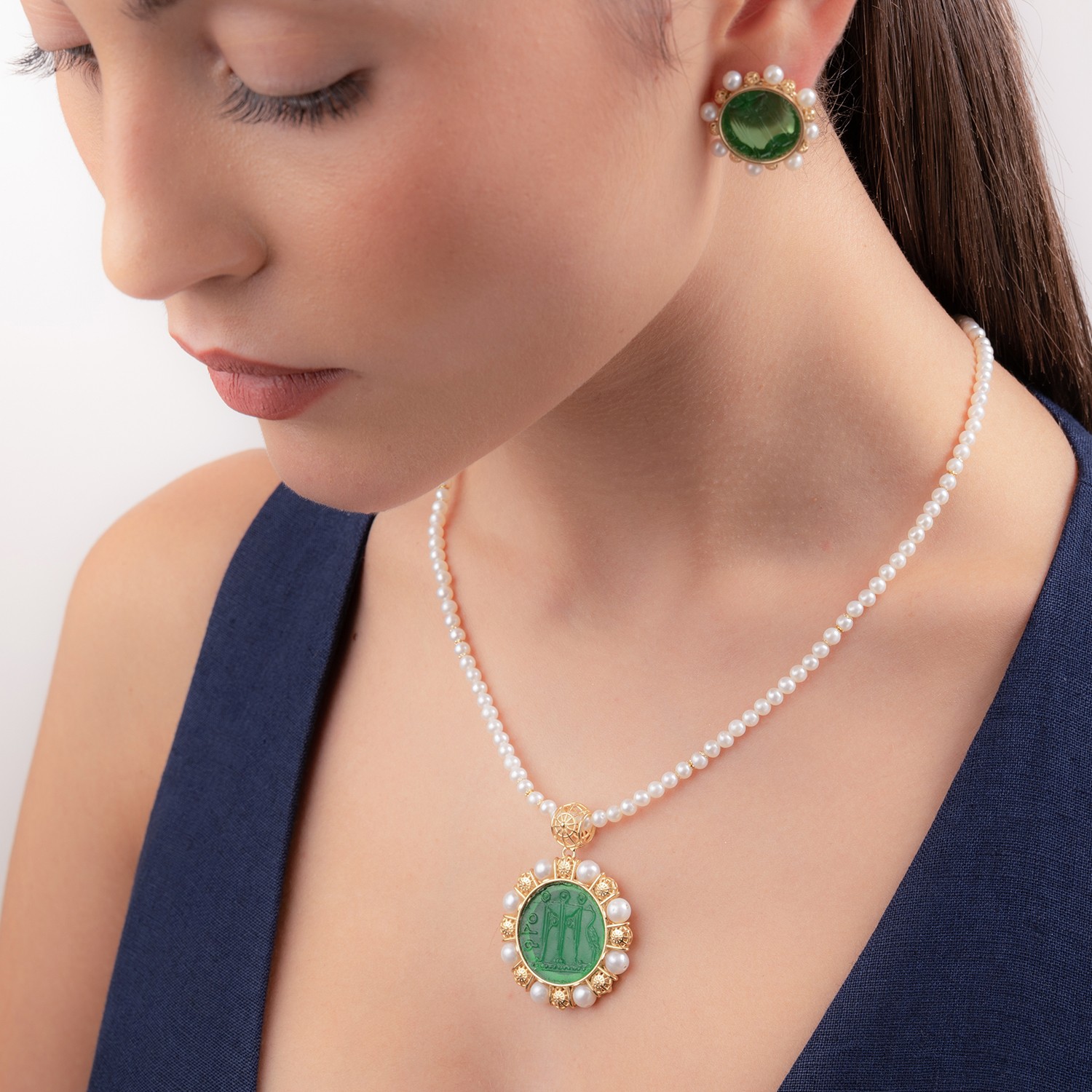 Ciondolo dal gusto ricercato e dalla linea avvolgente. Un'accurata lavorazione artigianale in oro e perle, abbraccia un' elegante pasta vitrea colorata, che raffigura un antico simbolo della Magna Grecia. Le suadenti atmosfere mediterranee, rivivono intensamente in ogni pezzo di questa collezione.