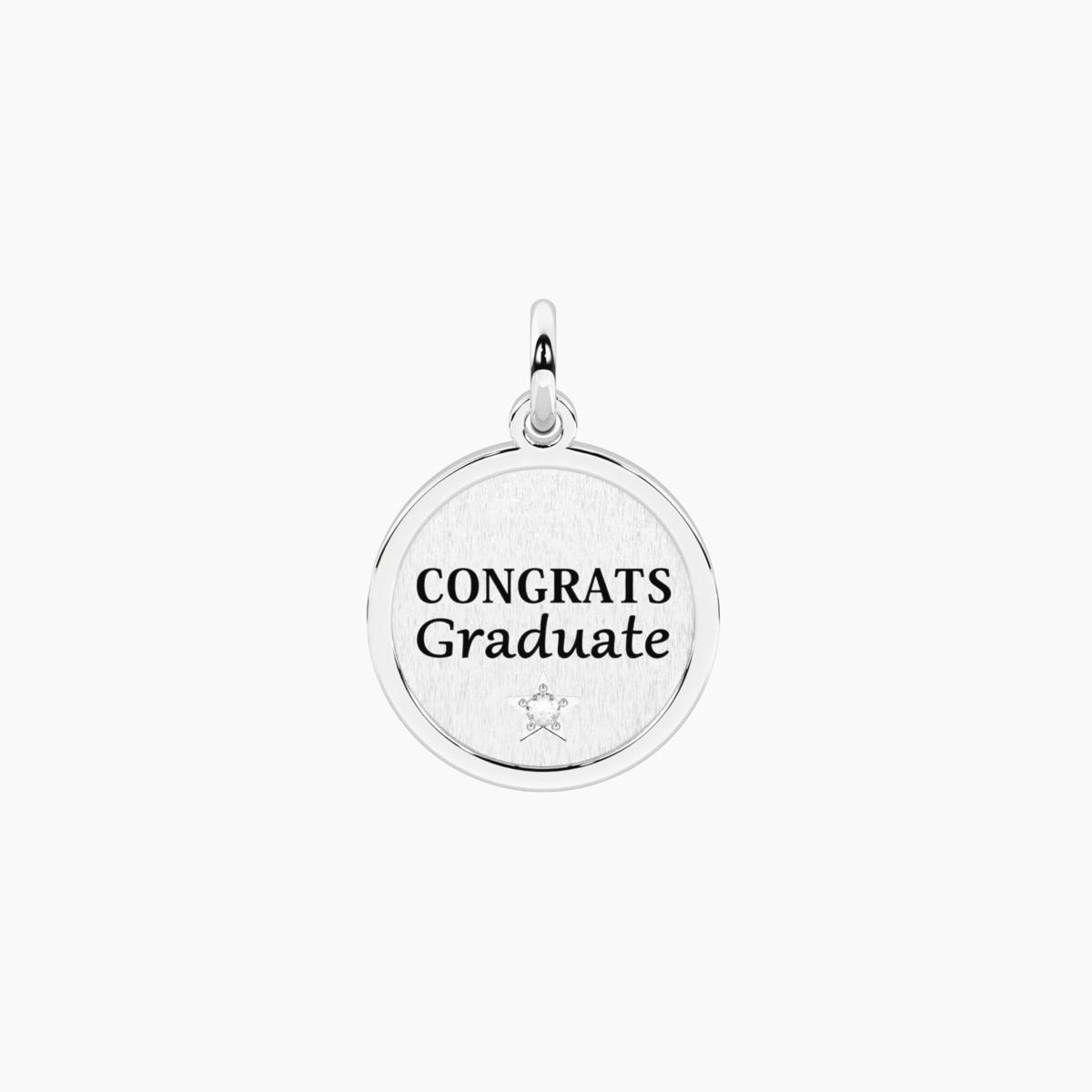 Ciondolo tondo in acciaio satinato e lucido con cristallo bianco e scritta "Congrats", retro ideale per incisione.