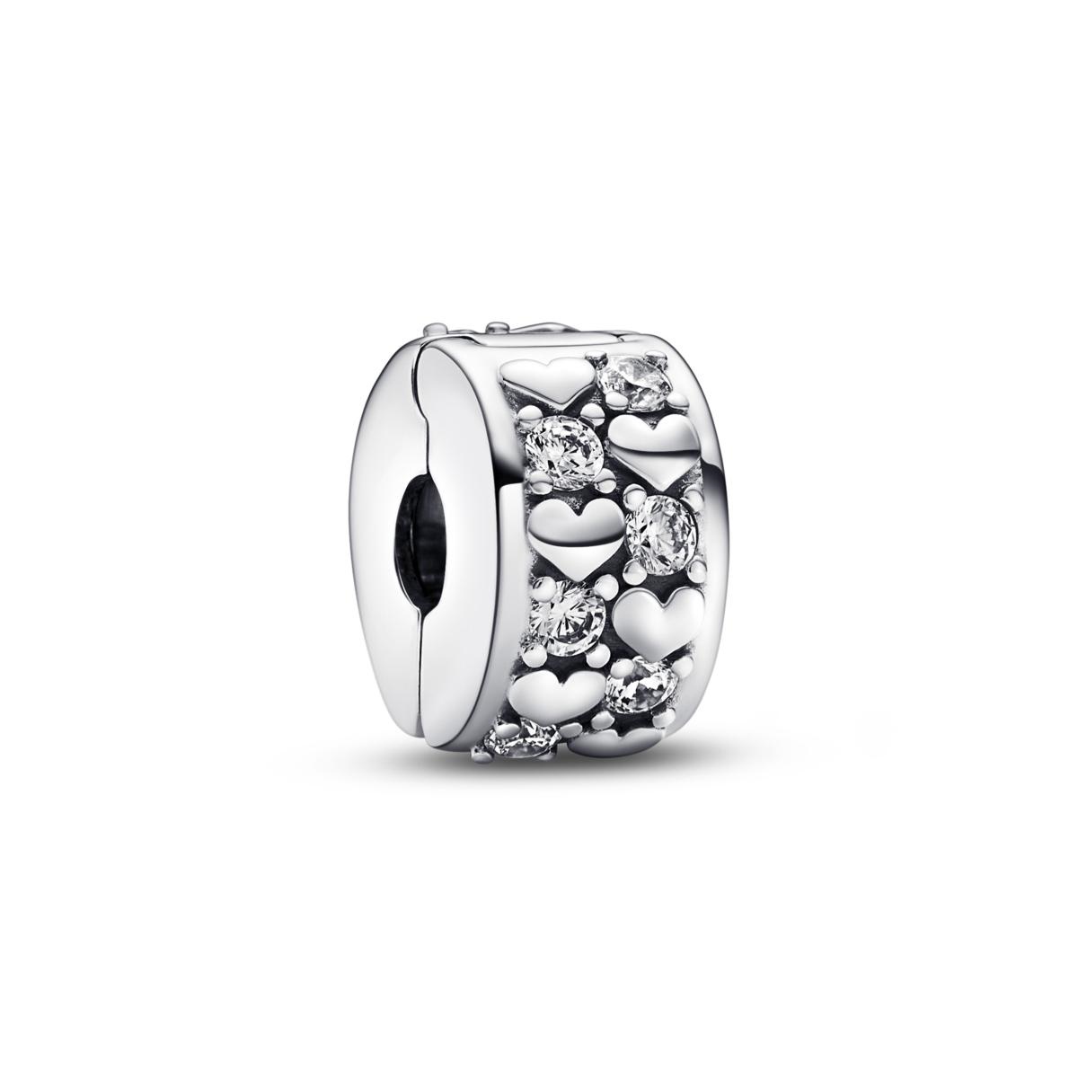 Celebra l'amore con la Clip Cuori e Pietre. Realizzata in Argento Sterling 925, la clip presenta due file di cuori in rilievo alternati a luminose pietre di zirconia cubica incolore. Indossala sul tuo bracciale preferito per far risaltare i charm che ami di pi¨ o regalala a una persona che ami come simbolo di amore. Nota: questa clip non Þ dotata di inserto interno in silicone e scorrerÓ lungo ilbracciale se non viene posizionata sulle filettature (ovvero sui divisori in rilievo).