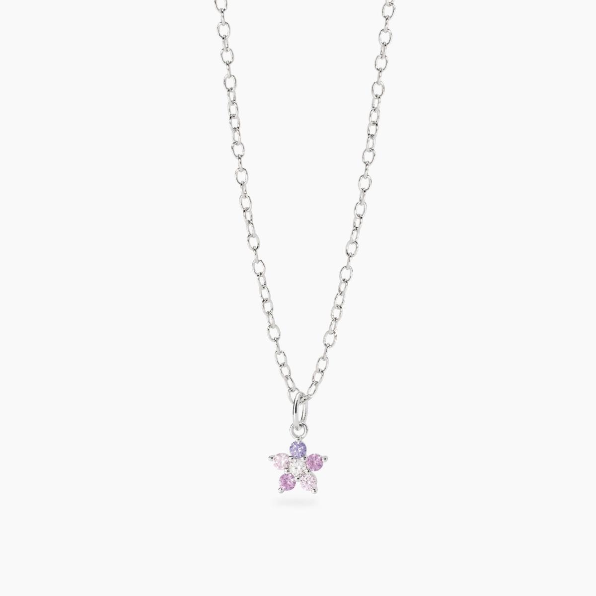 Collana regolabile da bambina con catena rolò in argento rodiato e ciondolo fiore in tormaline rosa sintetiche e zirconi.