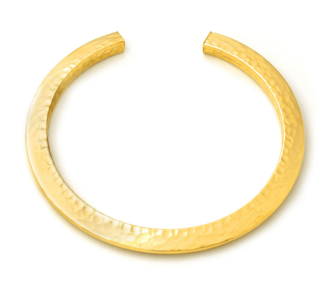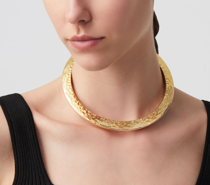 Una grande collana in argento dorato, materica, con una texture martellata che regala una straordinaria lucentezza. Blade racconta tutto l'amore di Giovanni Raspini per il design contemporaneo. Realizzata con lastra d'argento martellata a mano e quindi dorata.