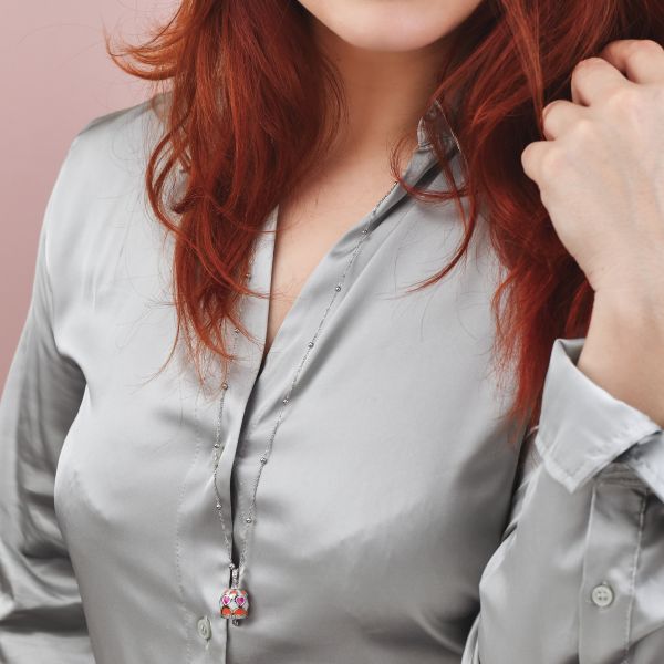 Collana in acciaio, ciondolo in bronzo con campanella rodiata con cuori fucsia e arancione su base bianco perlato, impreziosita da zirconi.