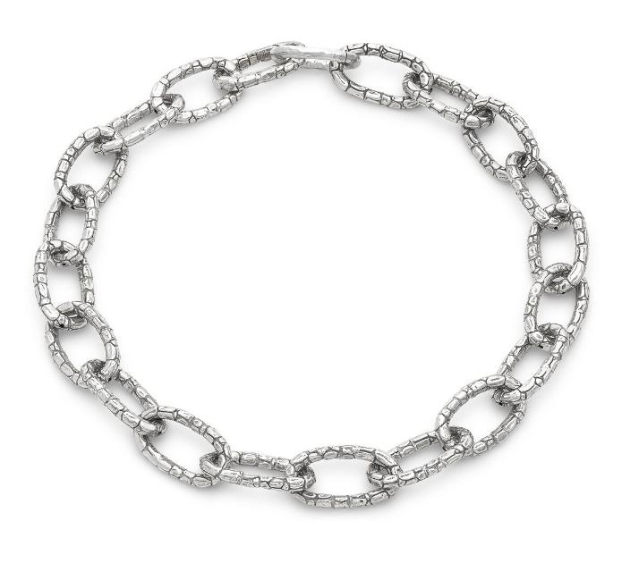 Un'importante e leggera collana illumina il volto con finiture eleganti e texture di coccodrillo. Le catene si susseguono in un fluire dinamico sul décolleté e donano tridimensionalità a questa collana, anche grazie alla brunitura di cui sono oggetto. Un gioiello perfetto sia per la quotidianità, sia per un outfit più ricercato. Interamente fatta a mano in azienda.