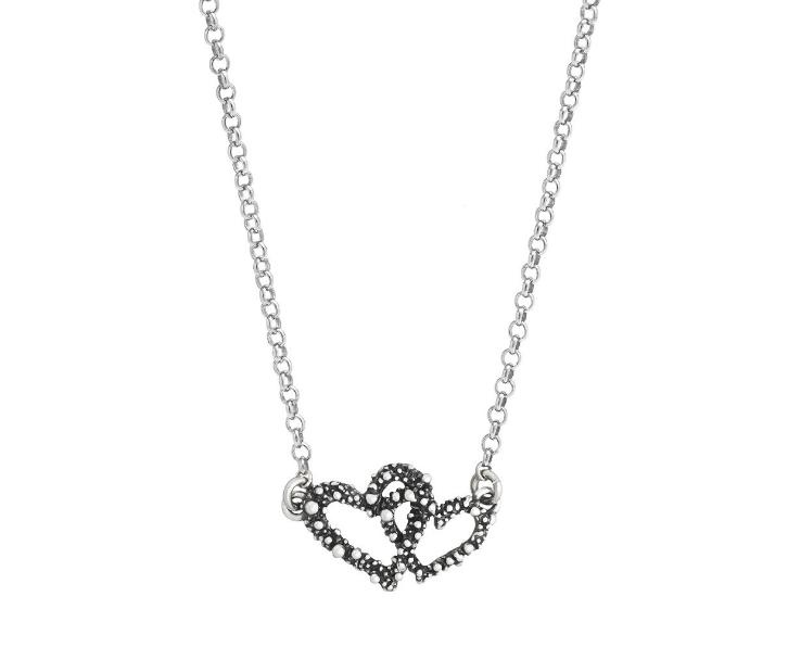 Cuori intrecciati come due anime nel loro amore. Uniti in un dialogo di luce, questi due cuori realizzati in argento e brunito in seguito, risaltano sul décolleté come simbolo di un amore indissolutoche non conosce limiti. Costituita da una catena morbida che si adagia sul collo, questa collana ha come protogonista un legame, puro ed eterno, tra due cuori che si incontrano non si lasciano più. Fatto a mano in azienda.