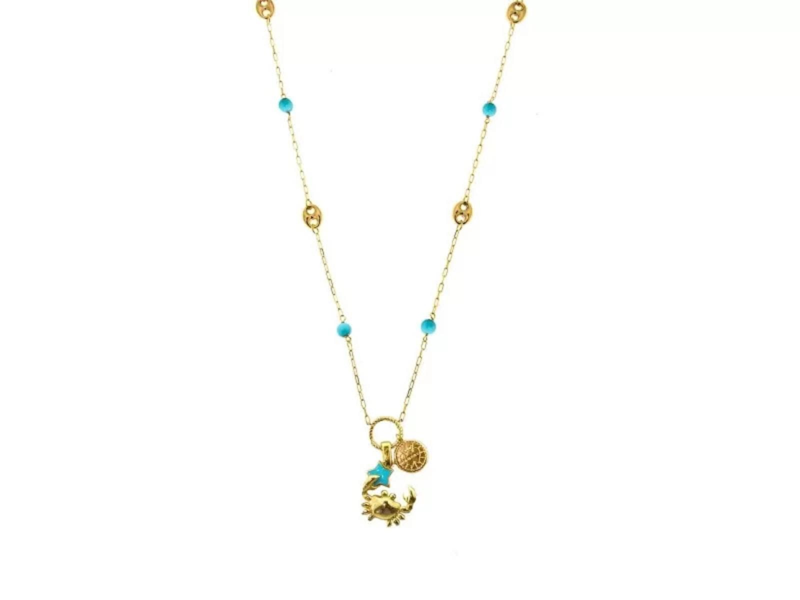 Allegro e raffinato, il pendente prende le forma del granchietto acchiappasogni che stringe tra le chele una brillante stella turchese smaltata.