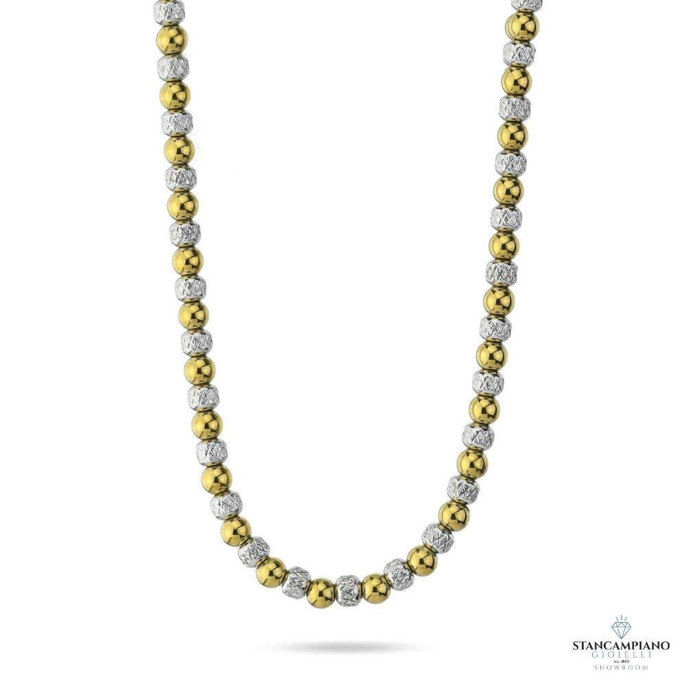 Collana in acciaio rodiato con boule lisce placcate oro giallo alternate a boule diamantate.