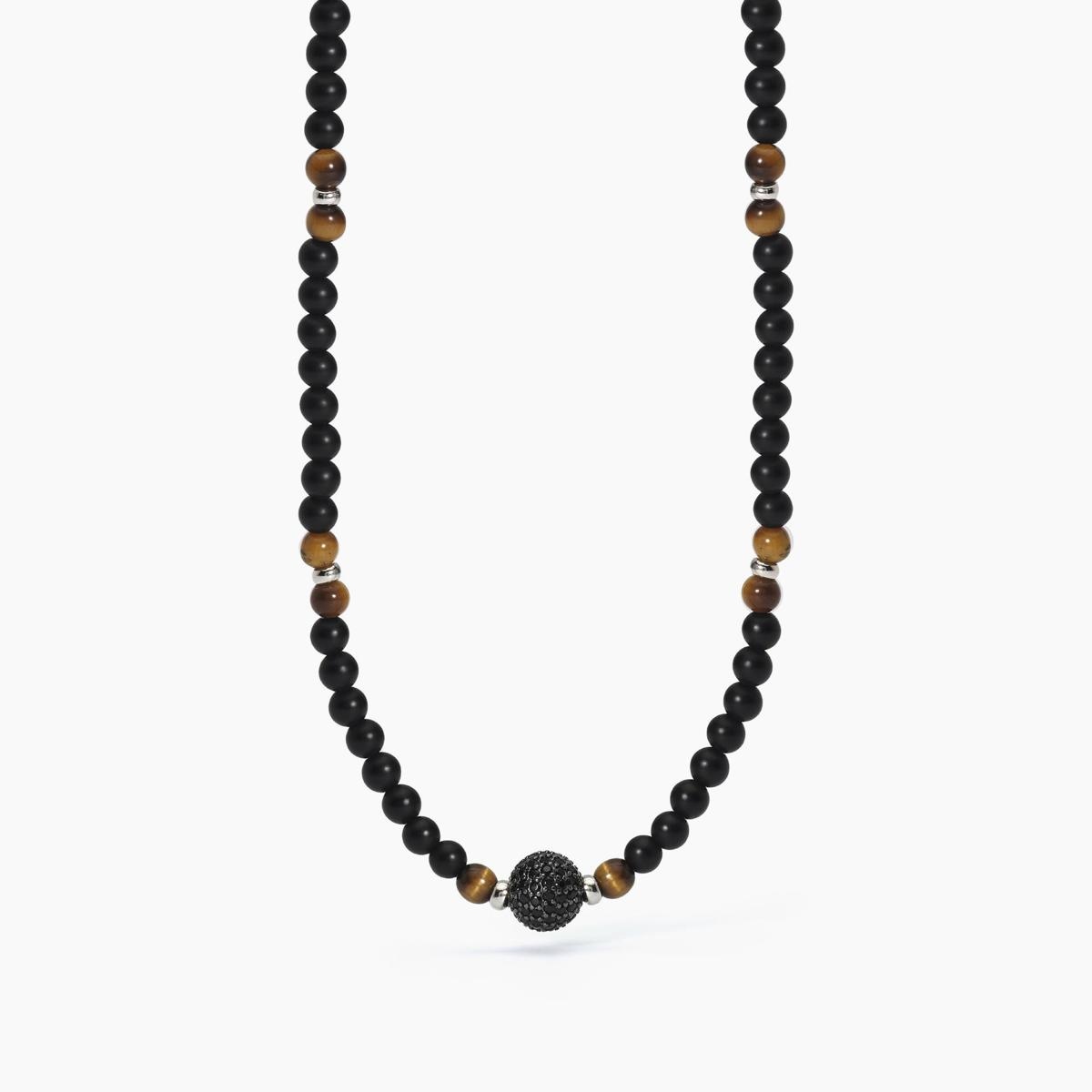 Collana da uomo in argento rodiato con Agata nera, occhio di tigre e sfera centrale con zirconi neri.