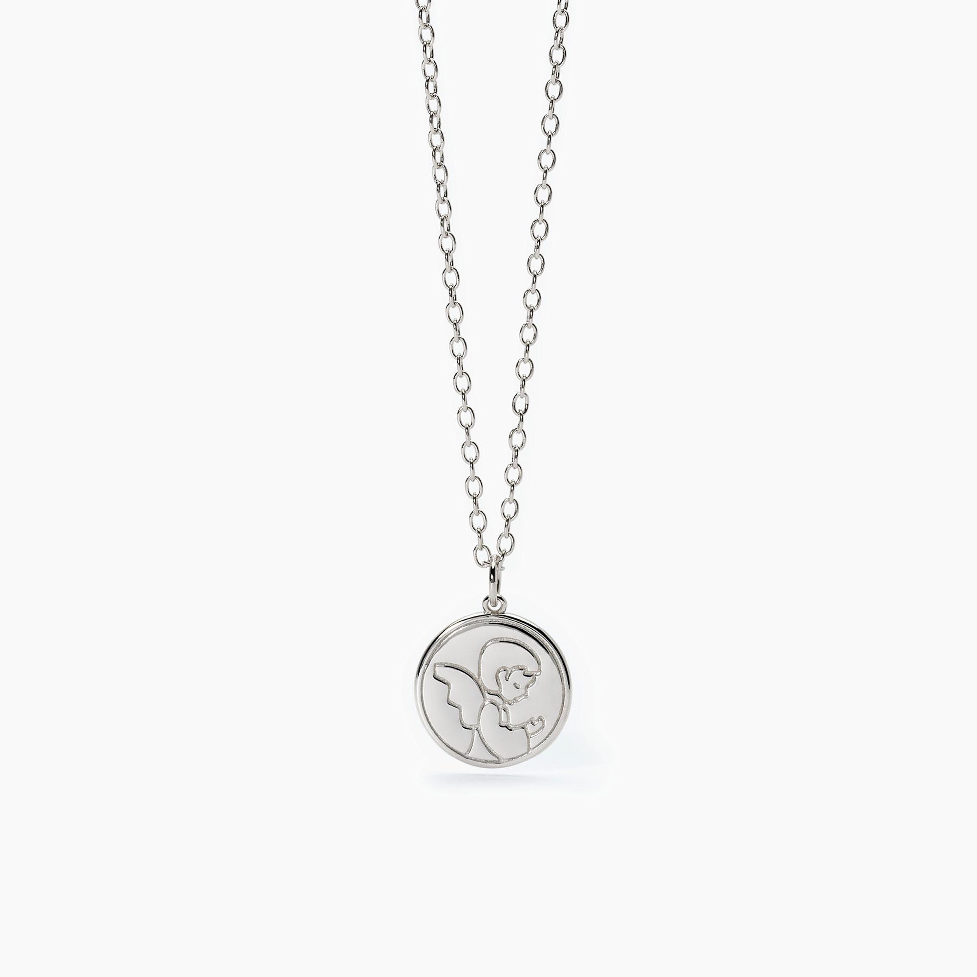 Girocollo bimba regolabile in argento rodiato con catena forzatina e medaglietta con angioletto. Retro ideale per incisioni, es. date, iniziali o nomi.