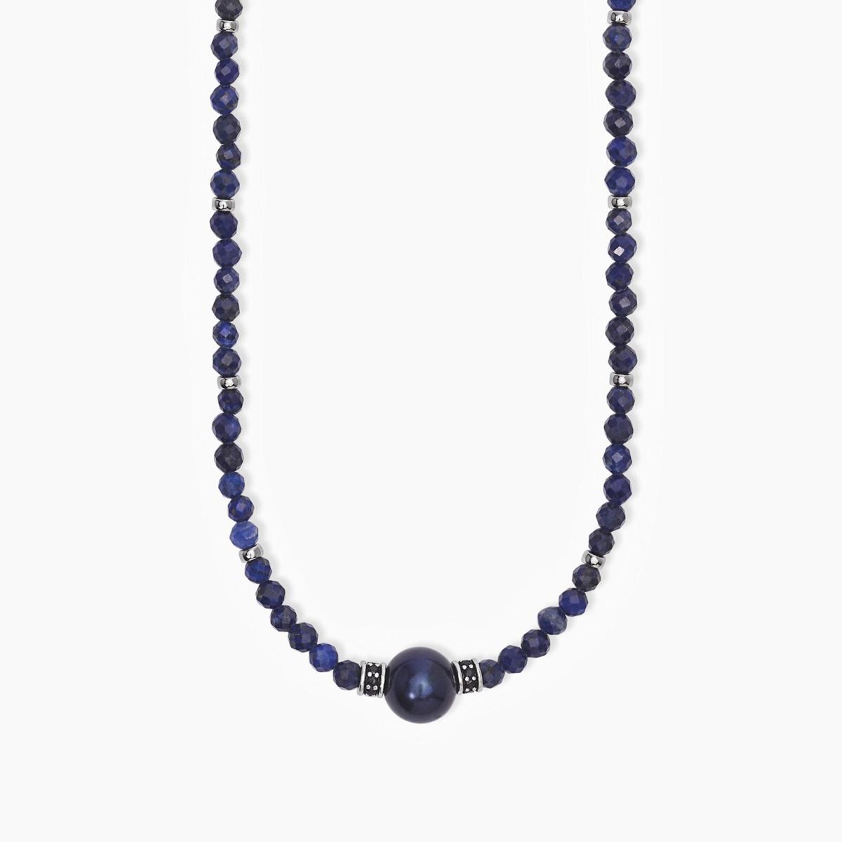 Collana da uomo in argento rodiato con pietre lapis, perla nera e inserti con zirconi neri.